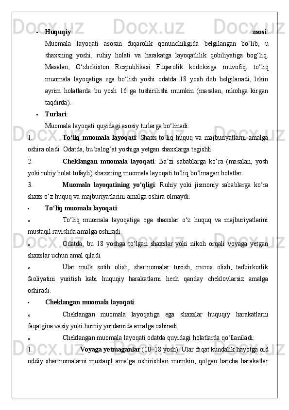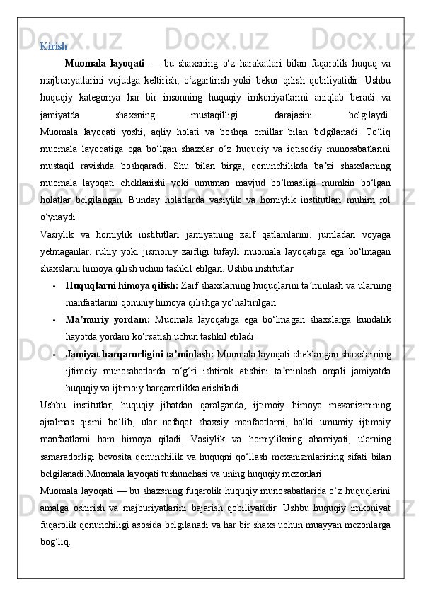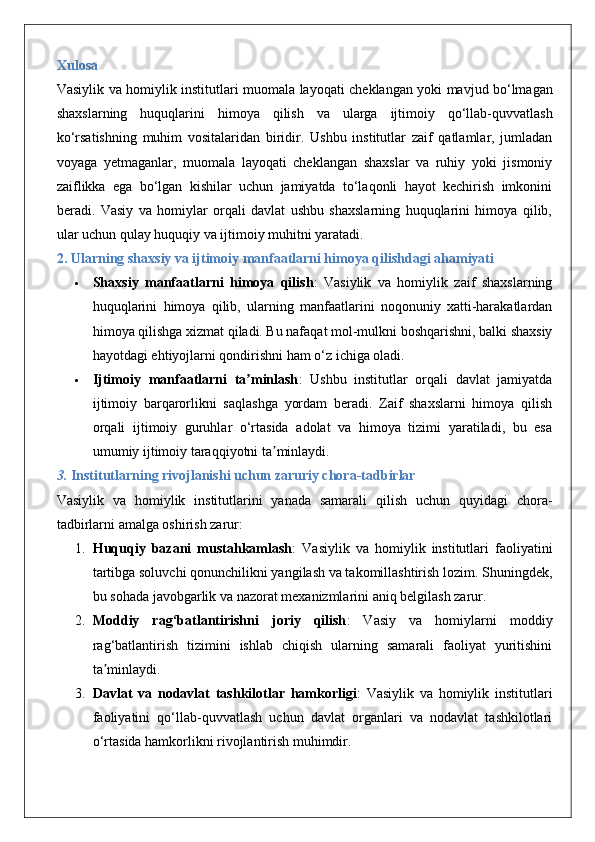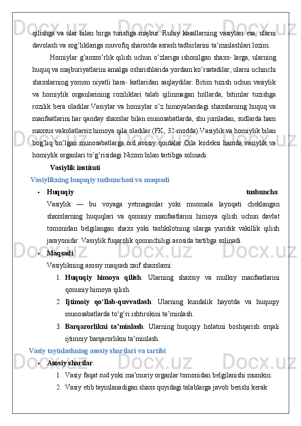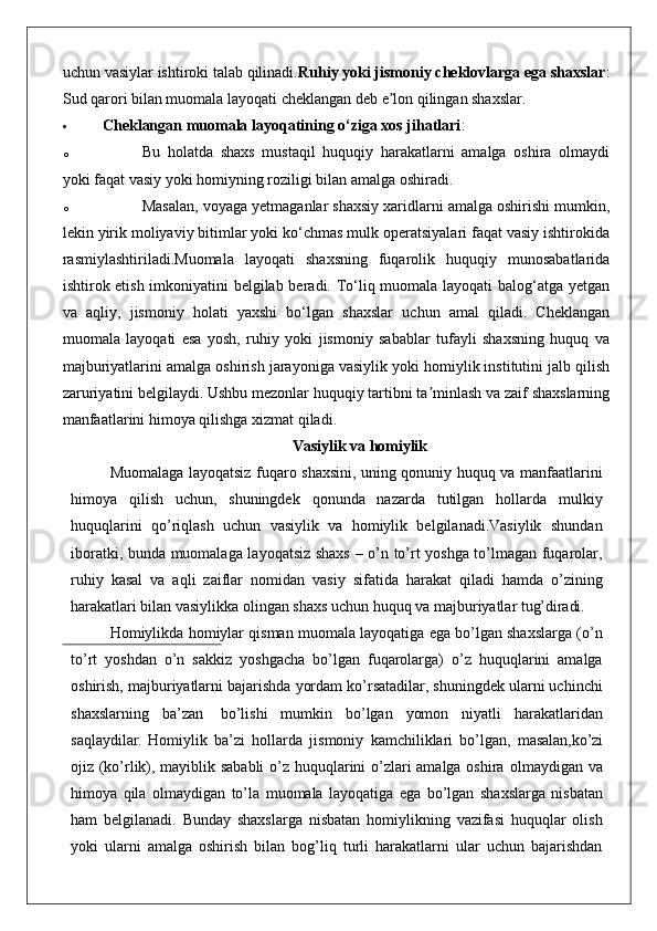 Muomala layoqati masalalarida vasiylik va xomiylik institutining qo‘llanilishi