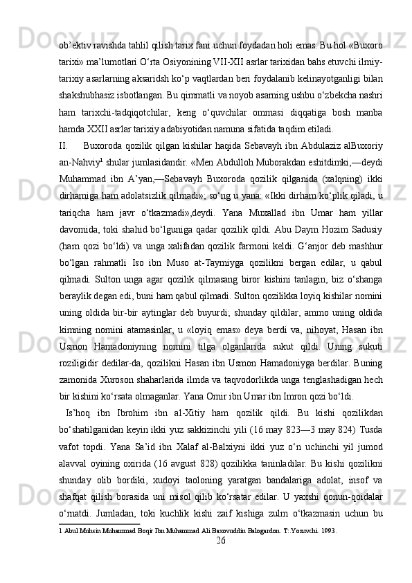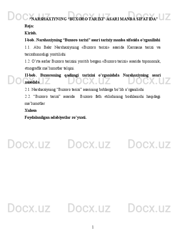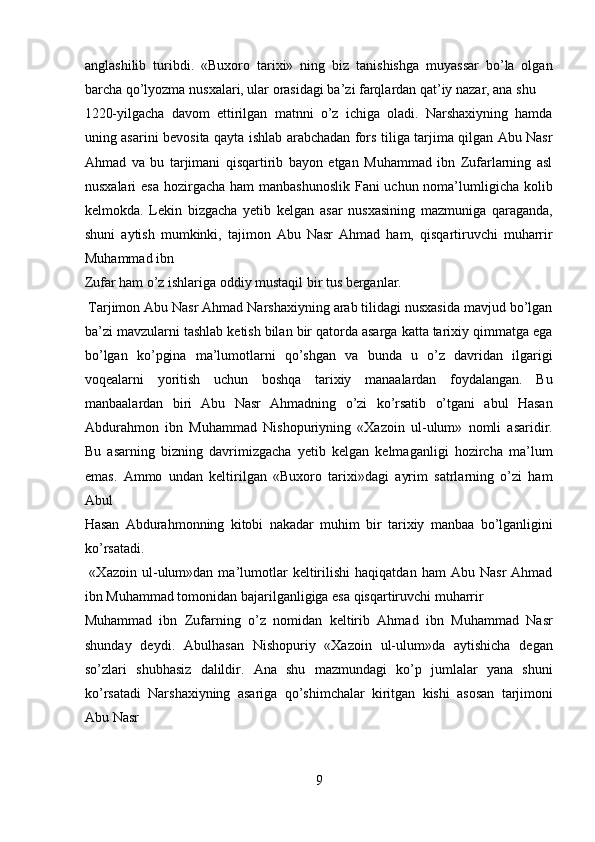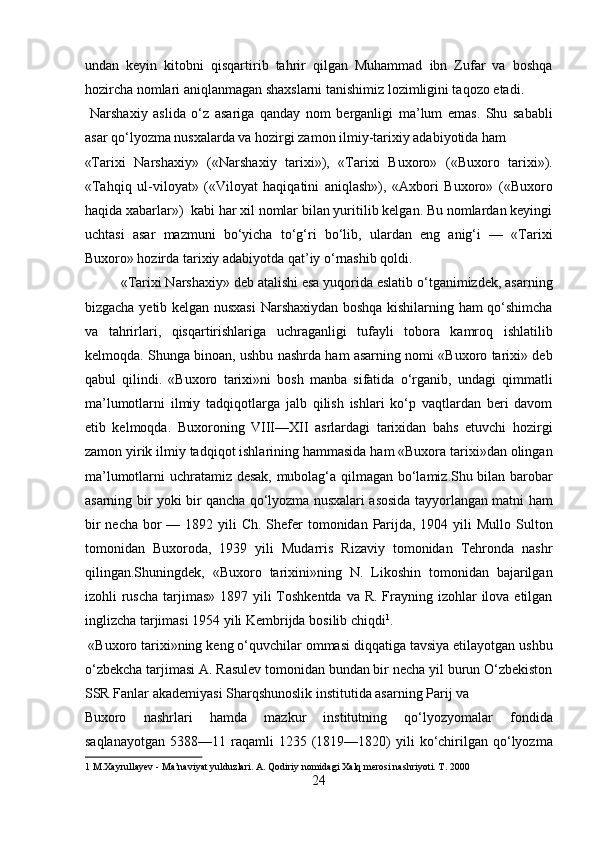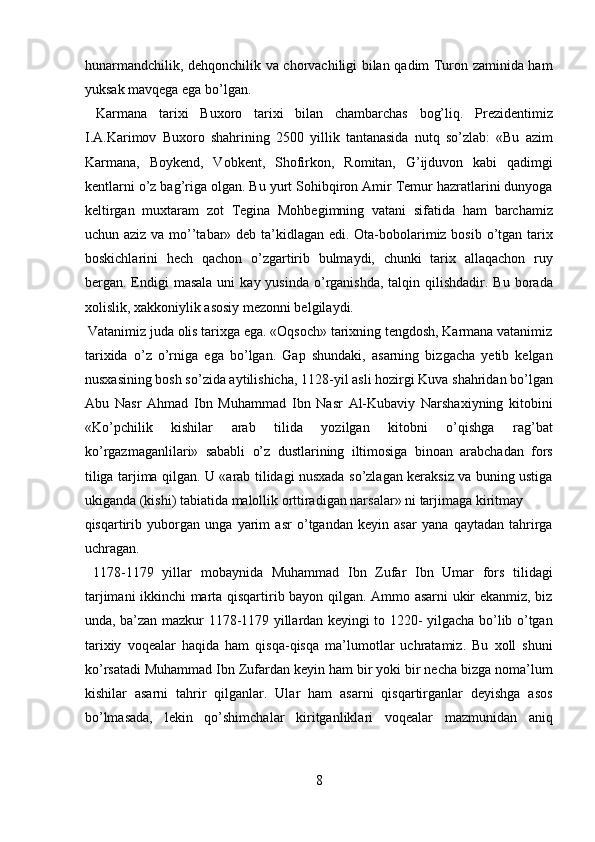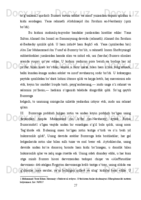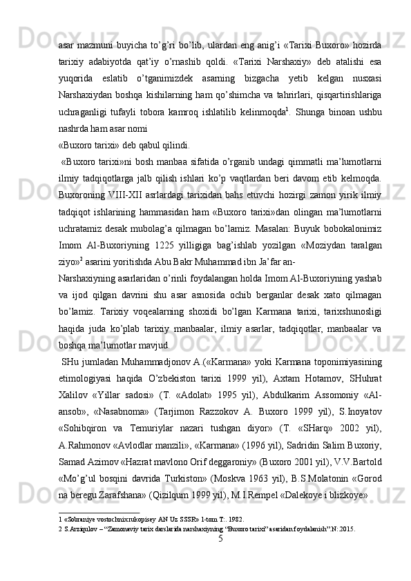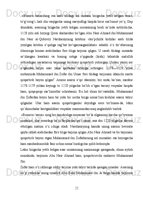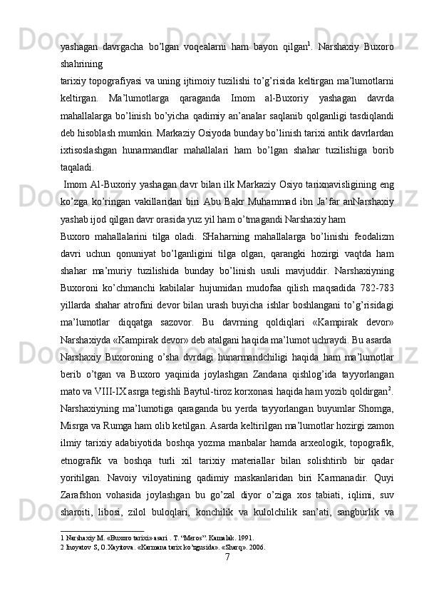 Narshaxiyning “Buxoro tarixi” asari tarixiy manba sifatida