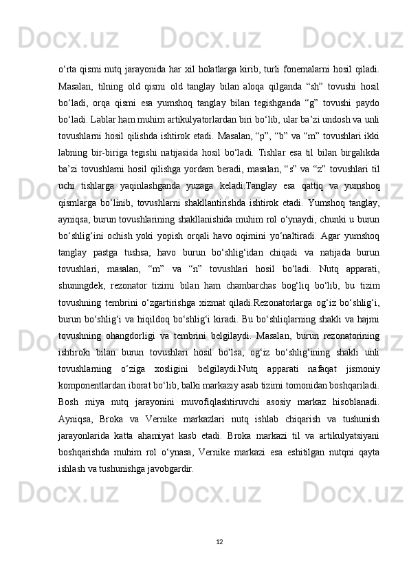2.3.Artikulyatsiya organlari til, lab, tanglay va ularning harakati………………...22