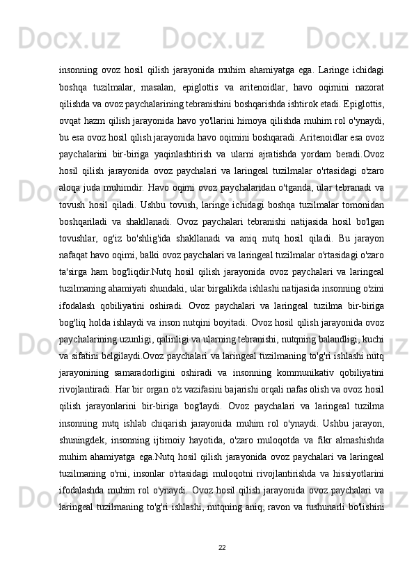 2.2.Ovozni shakllantiruvchi apparat tovush paychalari va laringeal tuzilma……..17
