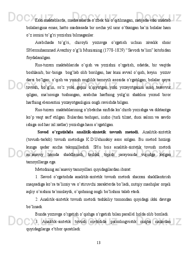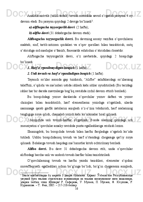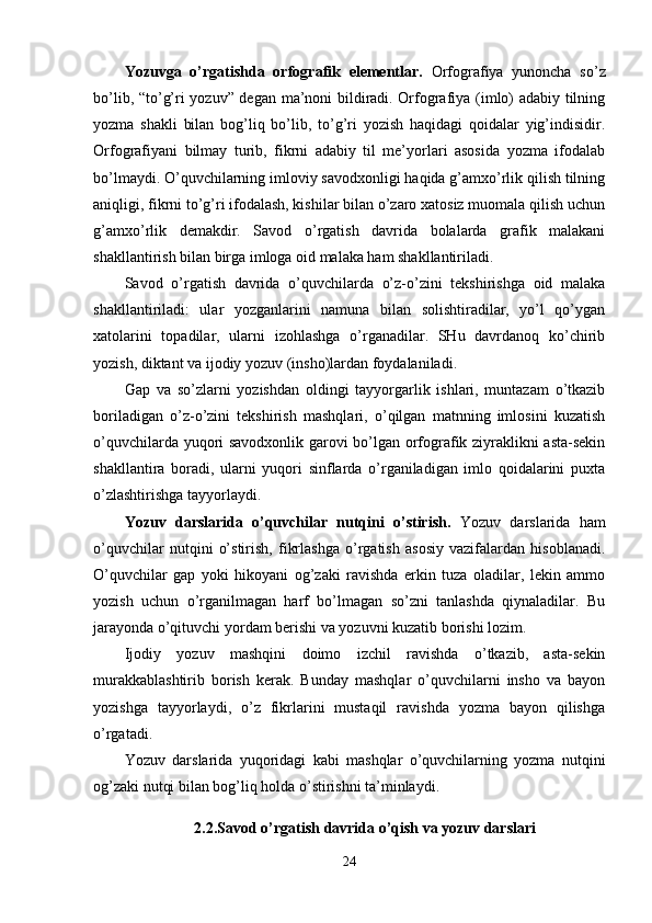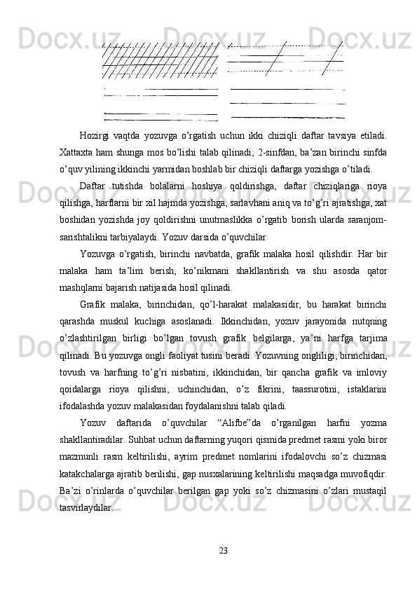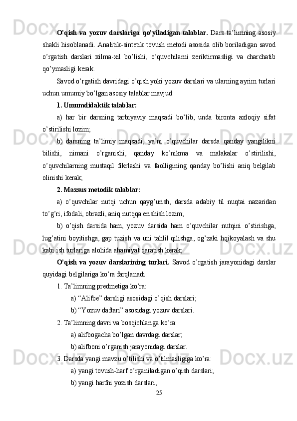 | 2.2. Savod o’rgatish davrida o’qish va yozuv darslari………………………. | 24 |
