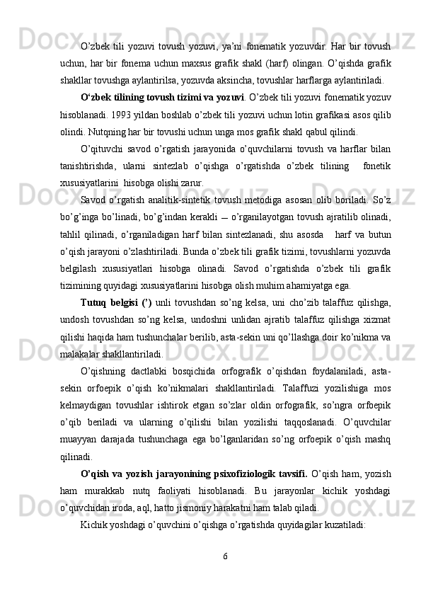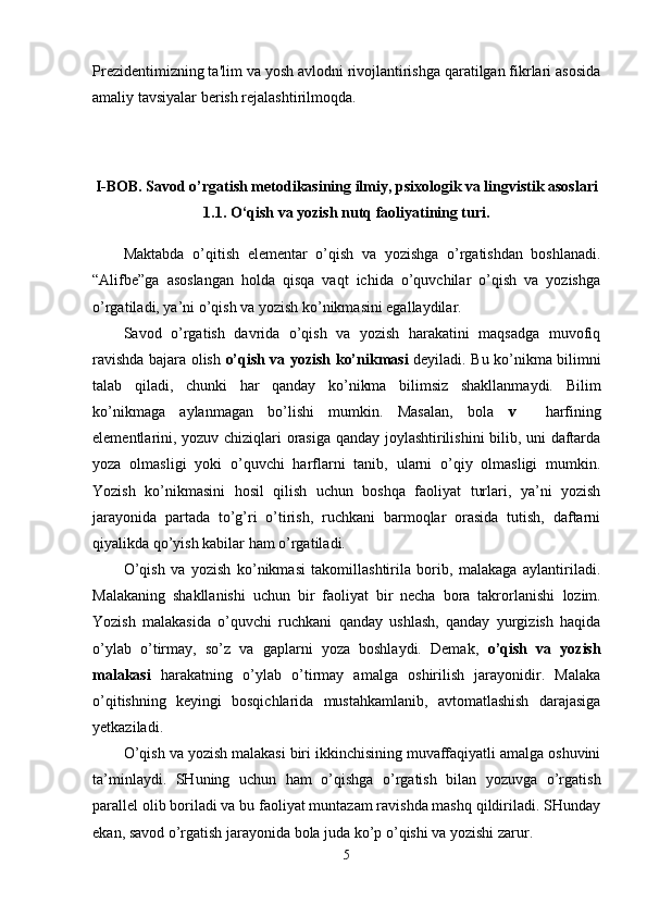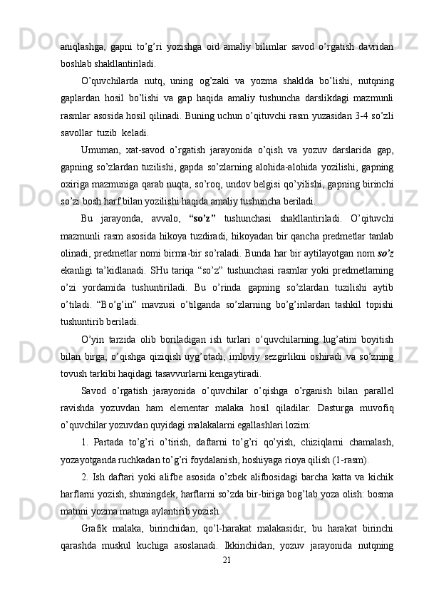 | 2.1. Savod o’rgatish jarayonida yozuvga o’rgatish…...…………………….. | 20 |