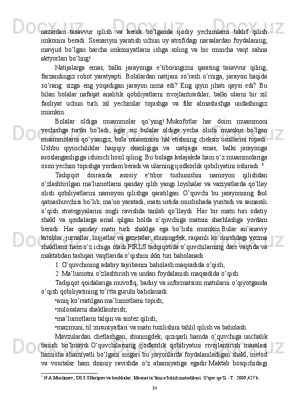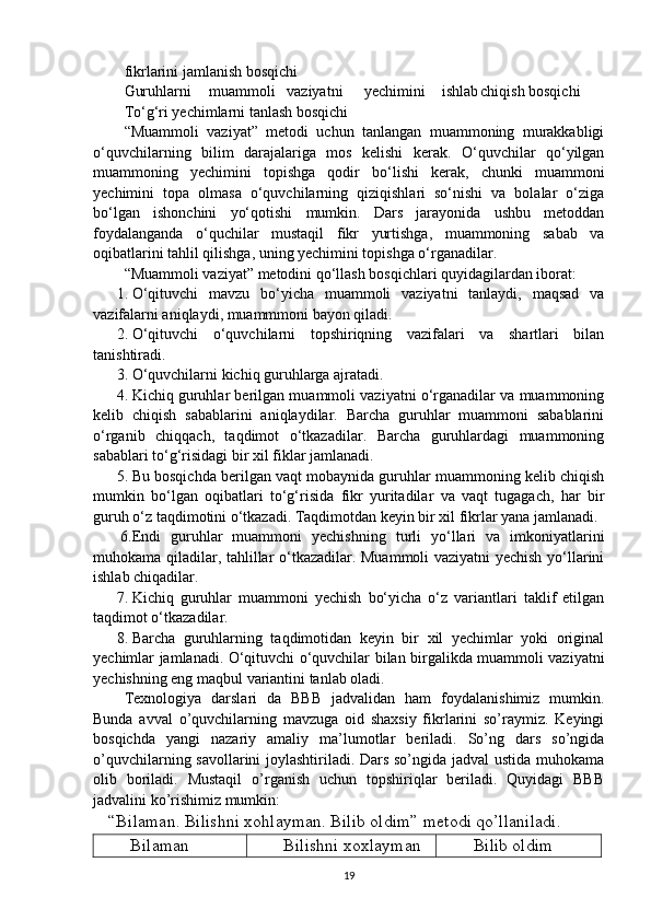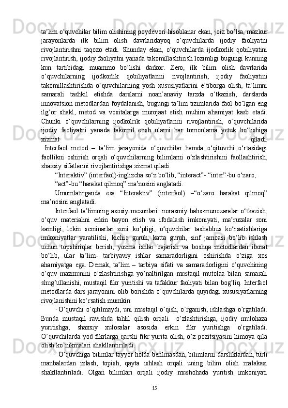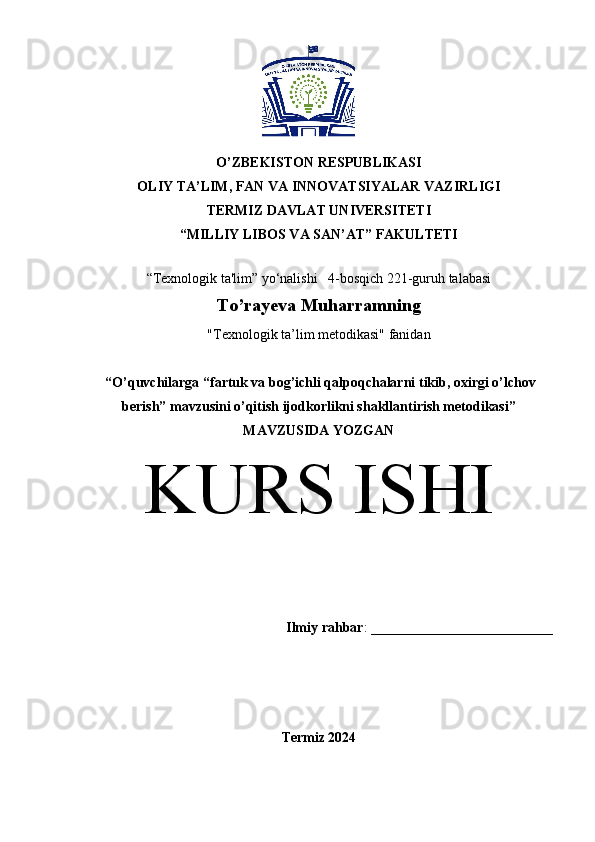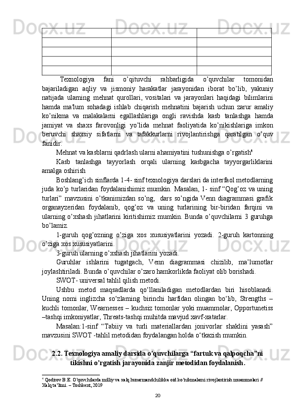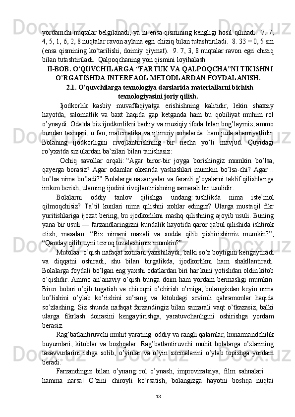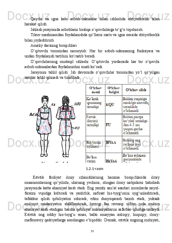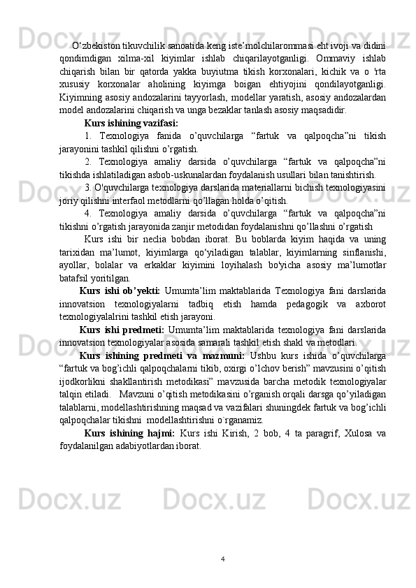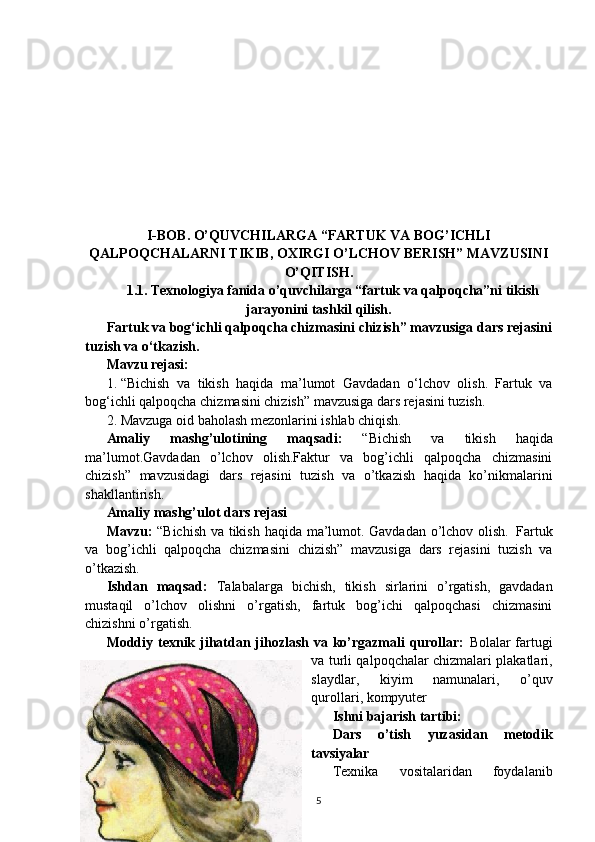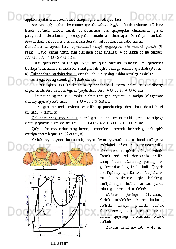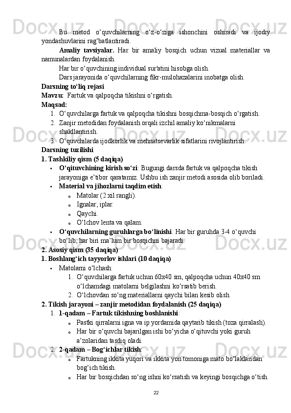 O’quvchilarga fartuk va bog’ichli qalpoqchalarni tikib, oxirgi o’lchov berish mavzusini o’qitish ijodkorlikni shakllantirish metodikasi
