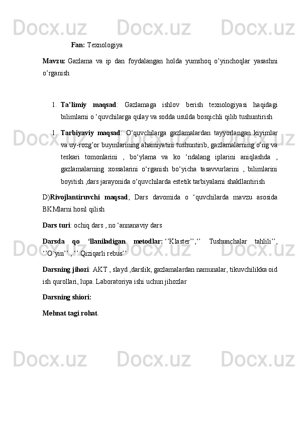 2.2. O’quvchilarga ip va gazlama mavzusini o’qitish bo’yicha dars ishlanma