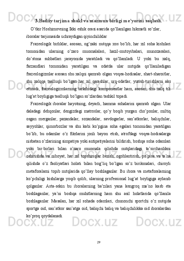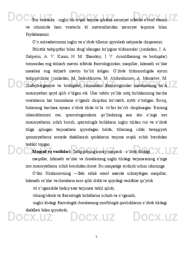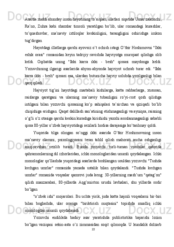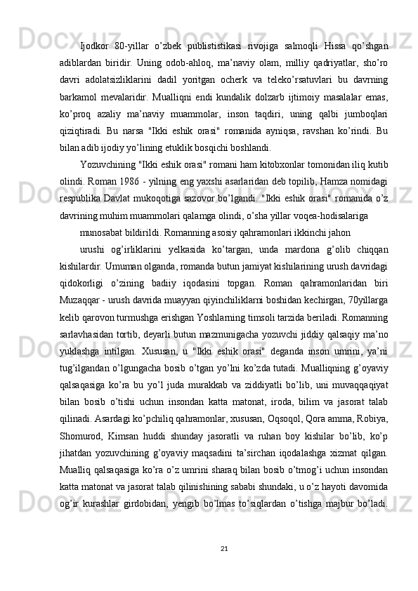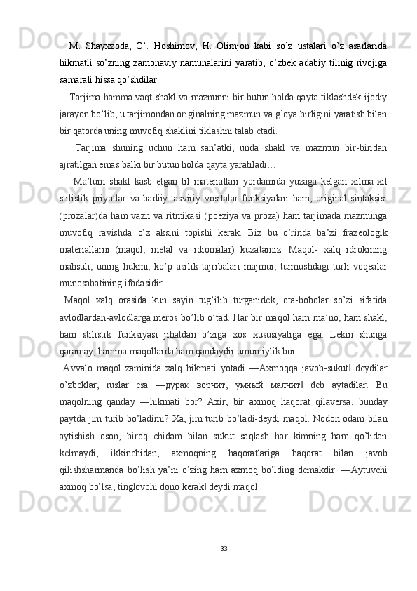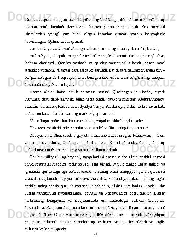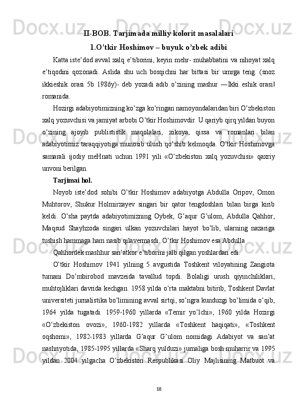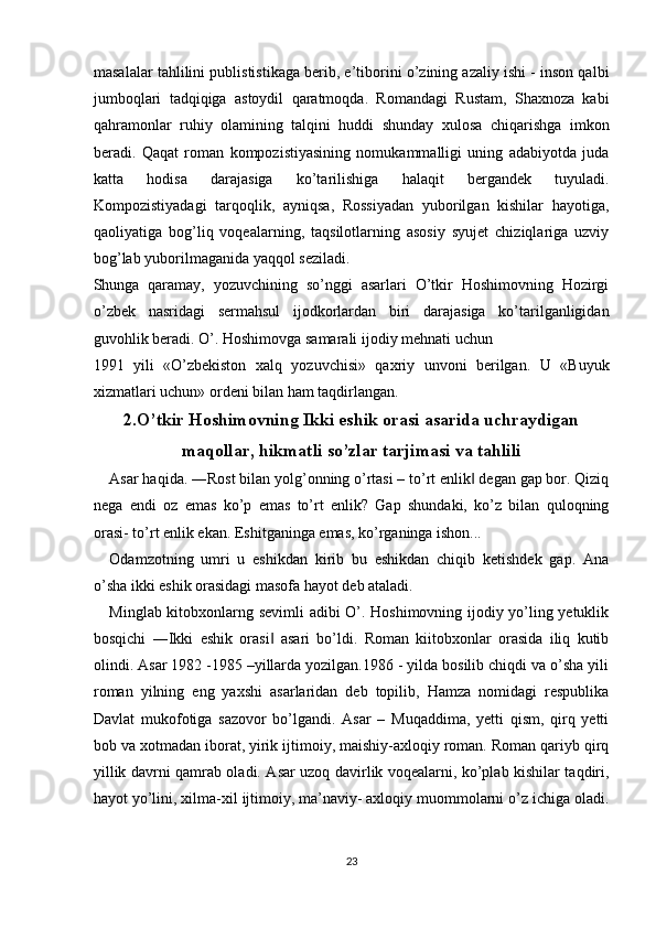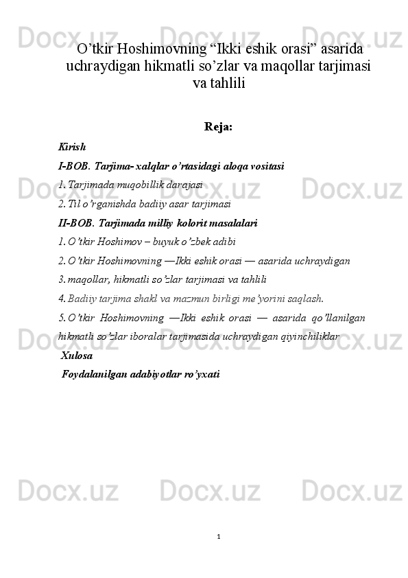 O’tkir Hoshimovning “Ikki eshik orasi” asarida uchraydigan hikmatli so’zlar va maqollar tarjimasi va tahlili