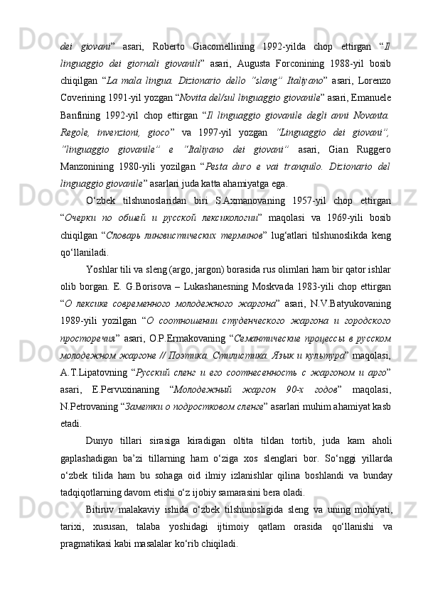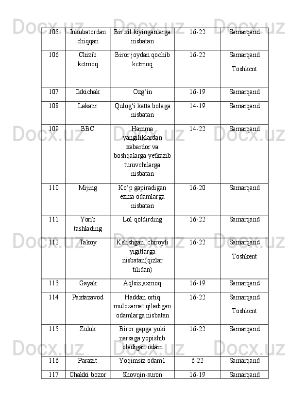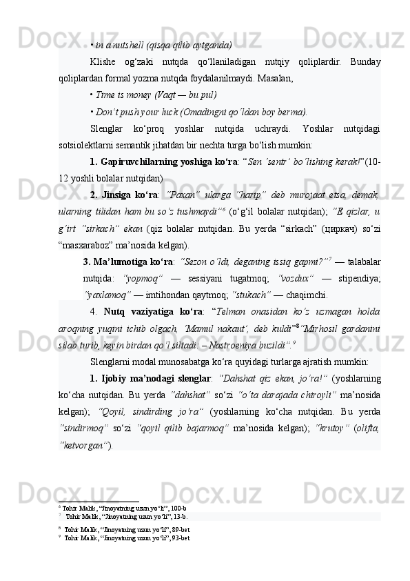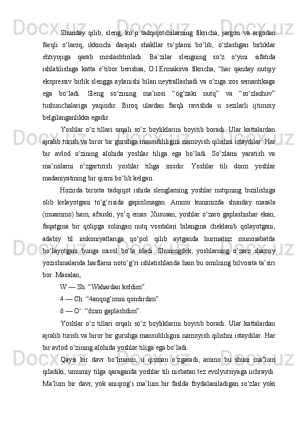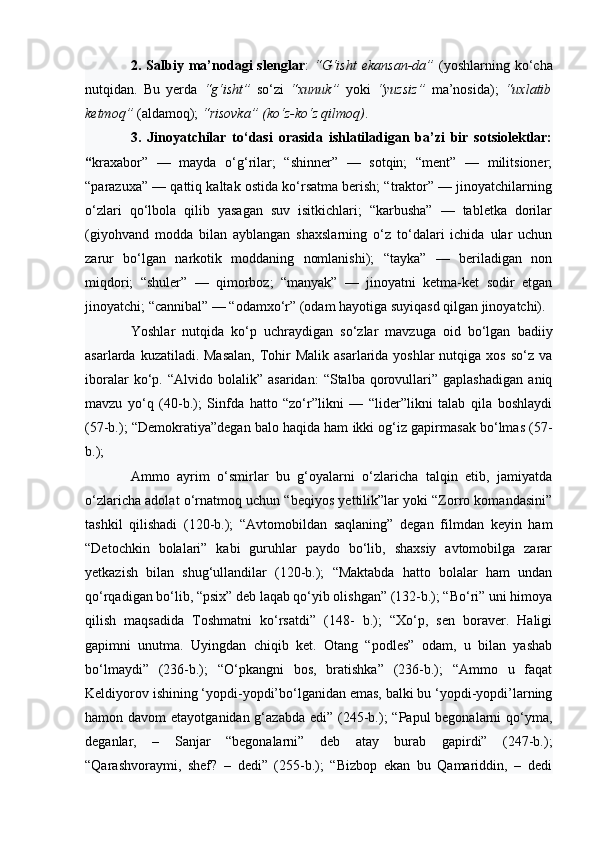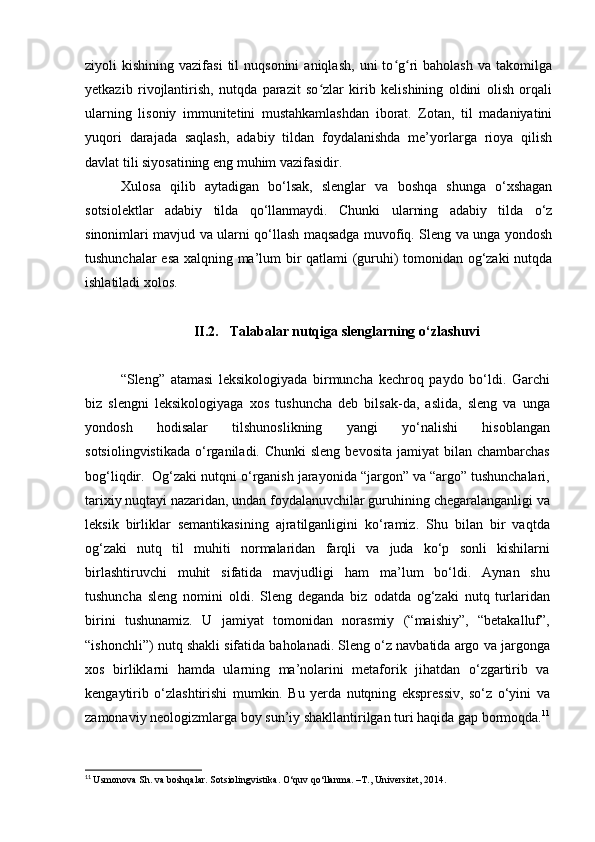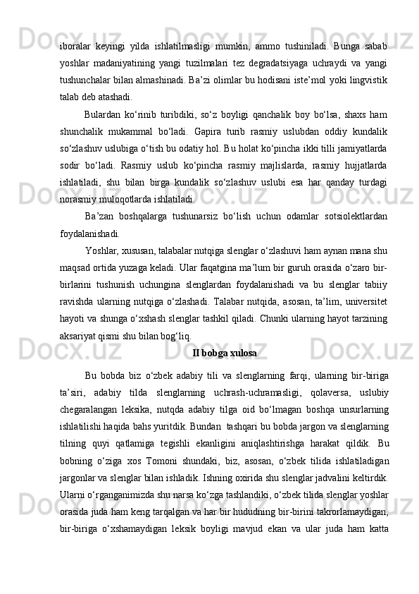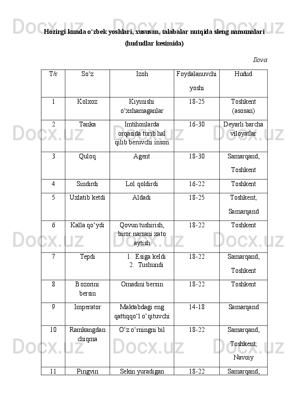 | 2.2. Talabalar nutqiga slenglarning o‘zlashuvi…………………..………. | |