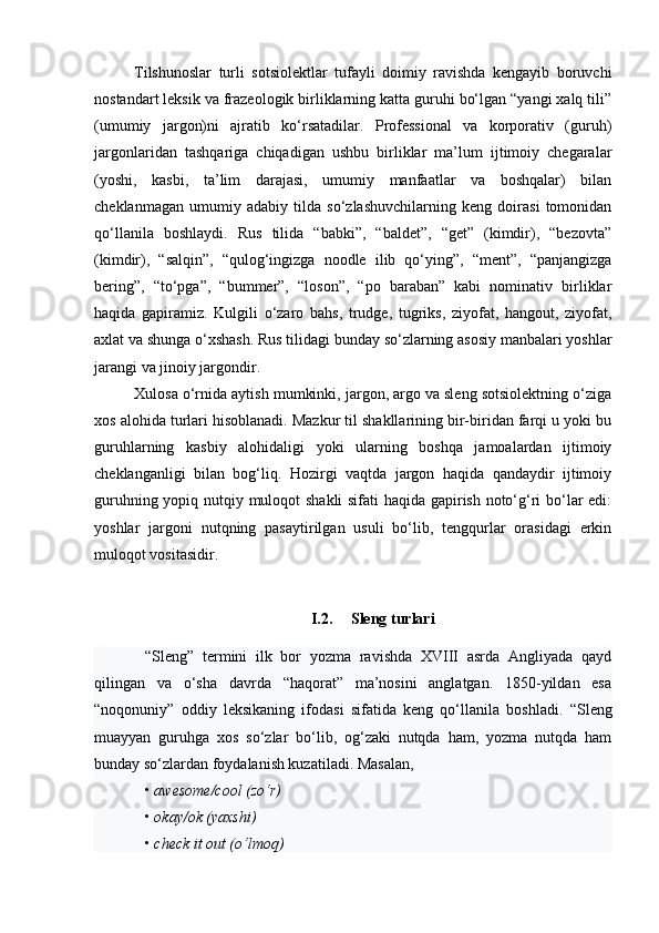 | 1.1. Tilshunoslikda sleng tavsifi va yondosh tushunchalardan farqi …… | |