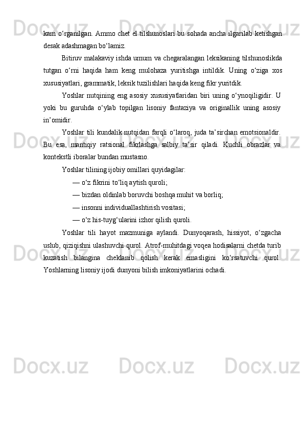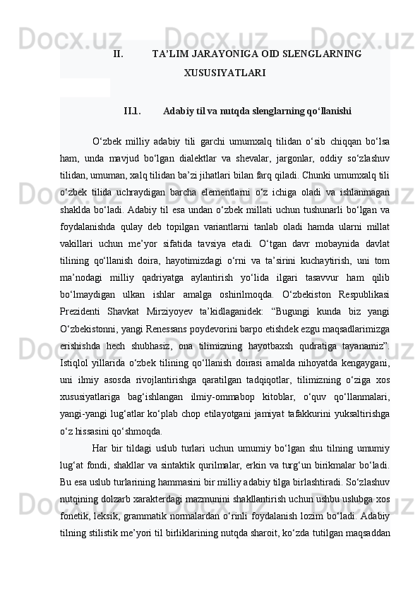 | II BOB. TA’LIM JARAYONIGA OID SLENGLARNING XUSUSIYATLARI………………………………… | |
