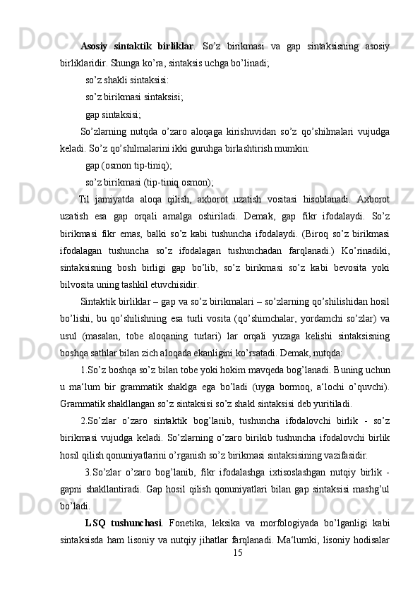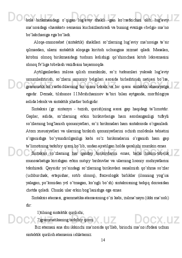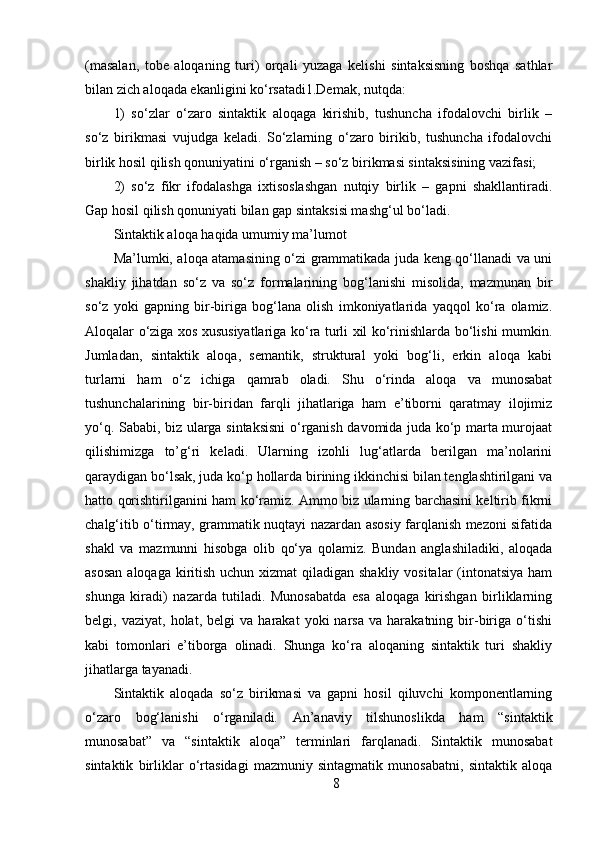 1.2 . Sintaktik aloqa haqida umumiy ma’lumot…………………………...12