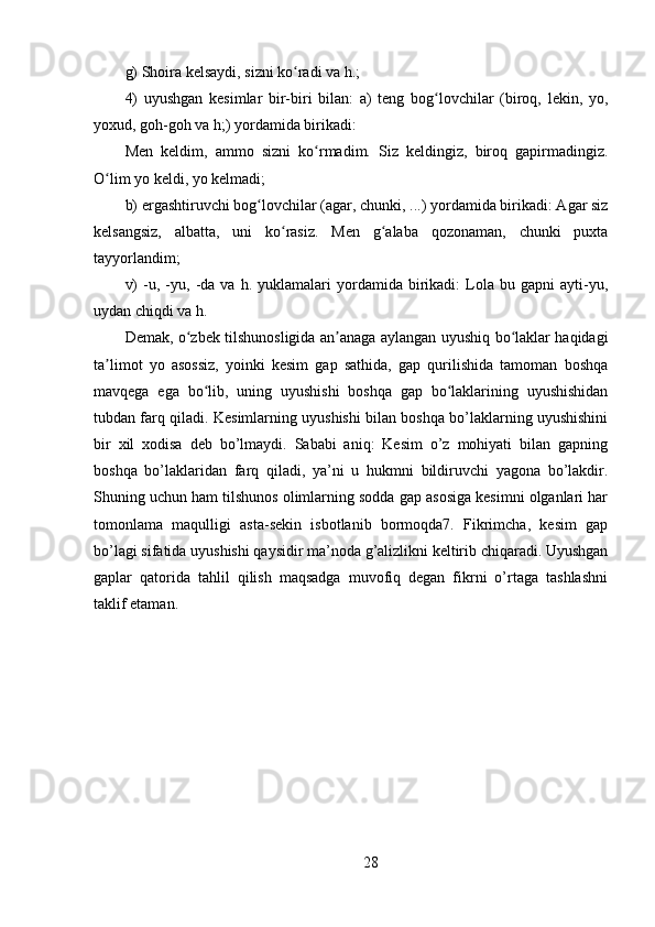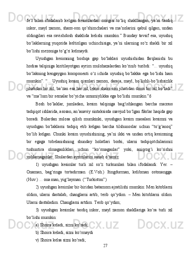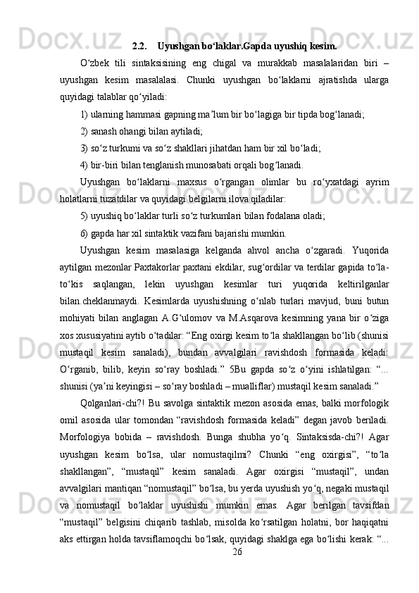 2.2. Uyushgan bo‘laklar. Gapda uyushiq kesim…………………………..26