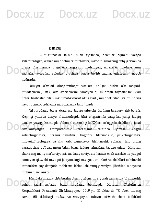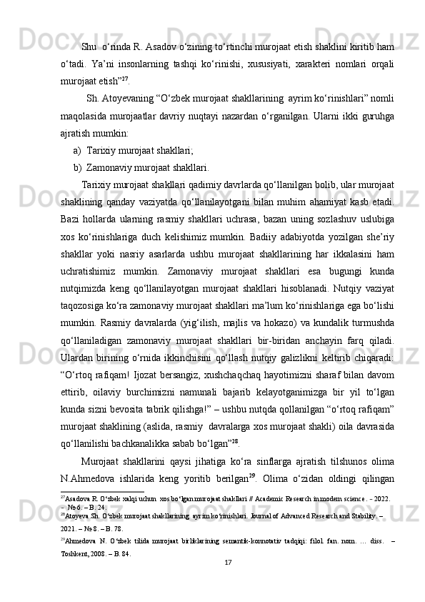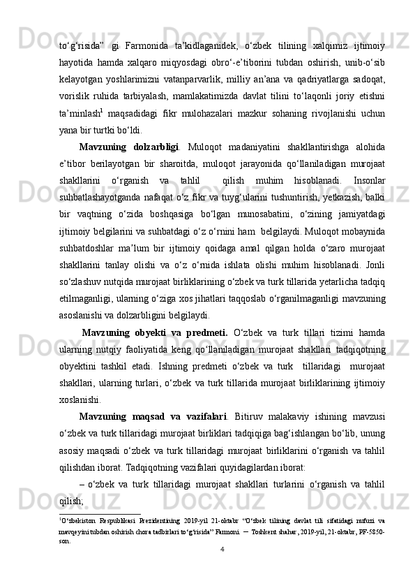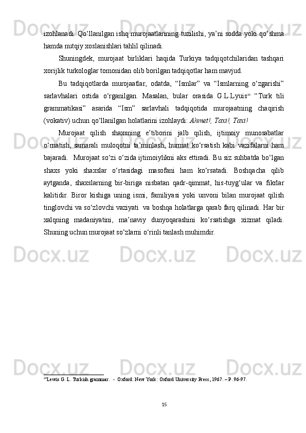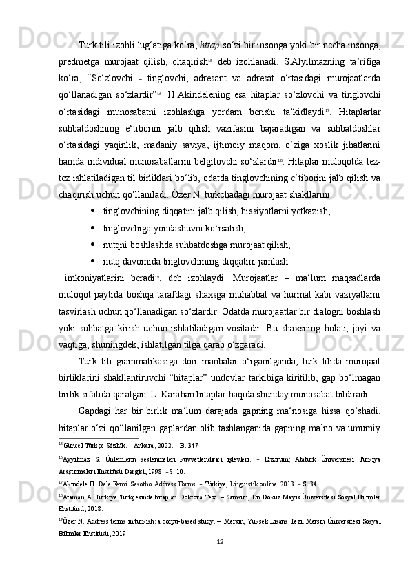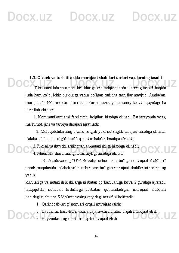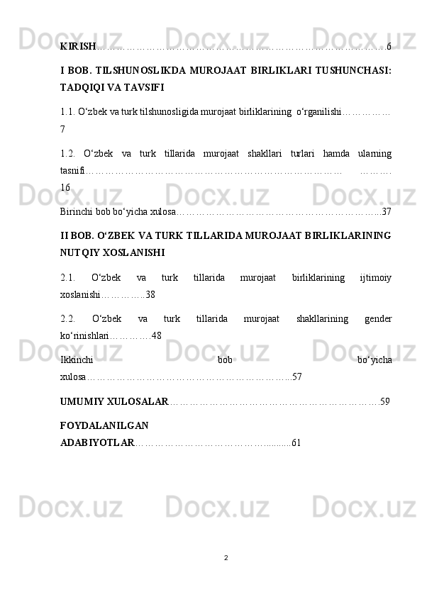 1.2. O‘zbek va turk tillarida murojaat shakllari turlari hamda ularning tasnifi…………………………………………………………………… ………. 16