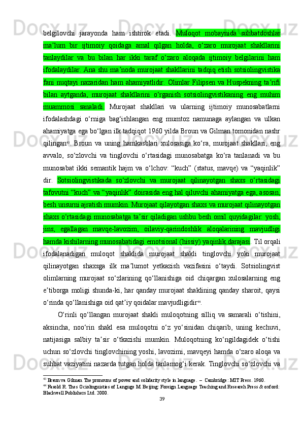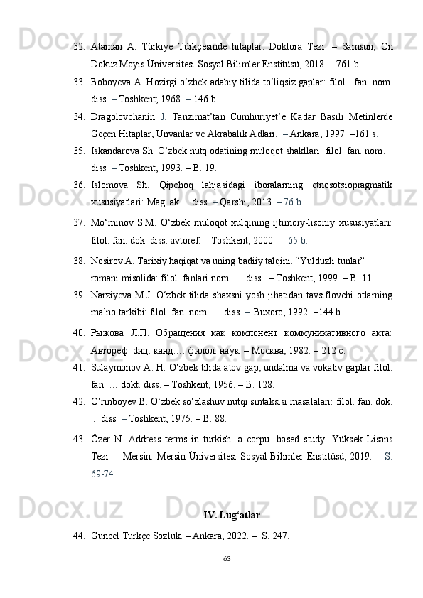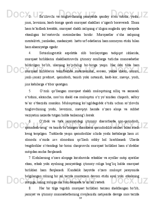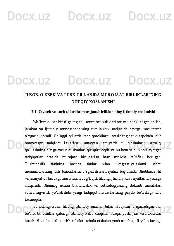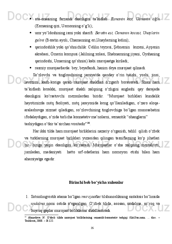 2.1. O‘zbek va turk tillarida murojaat birliklarining ijtimoiy xoslanishi…………..38