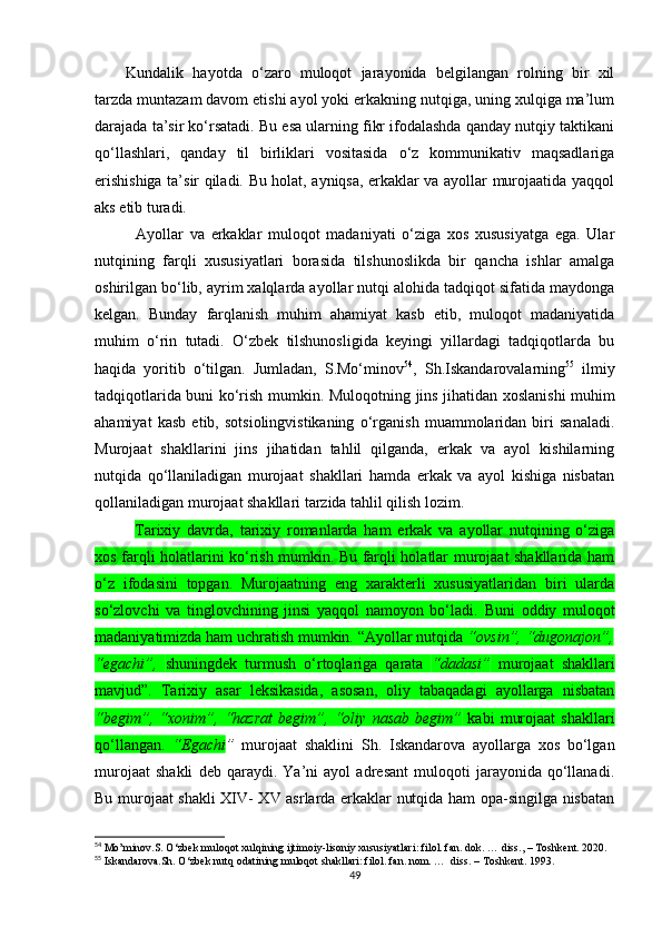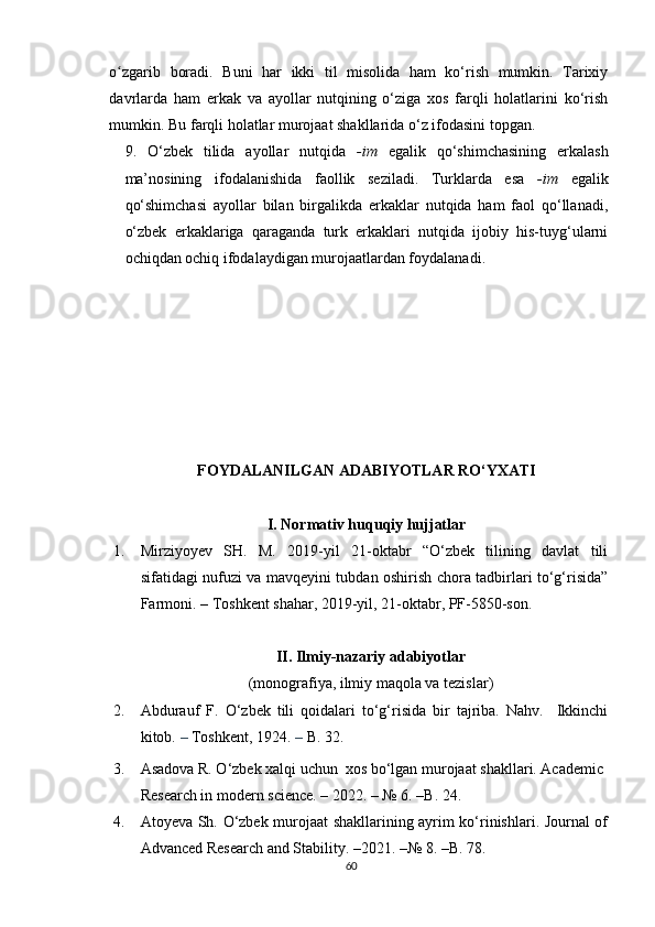 2.2. O‘zbek va turk tillarida murojaat shakllarining gender ko‘rinishlari………….48