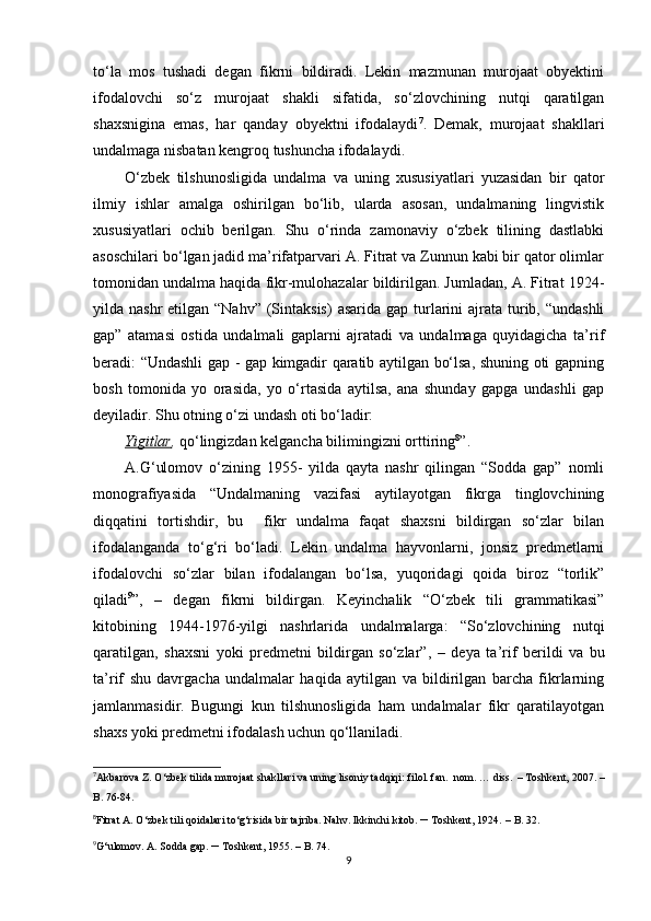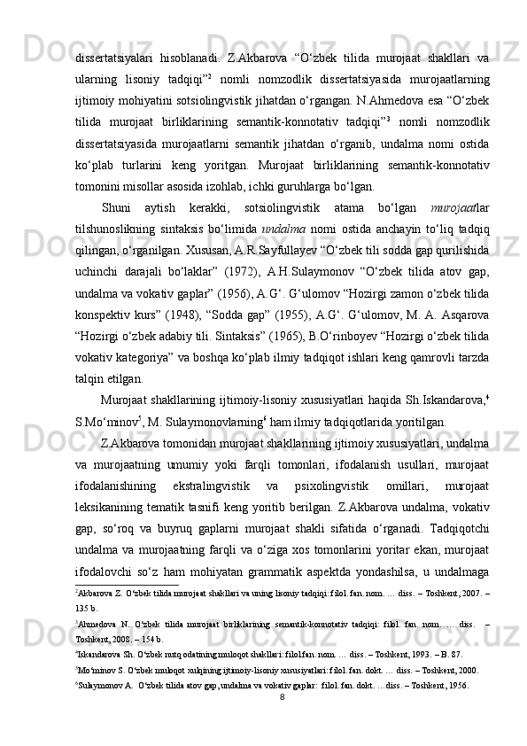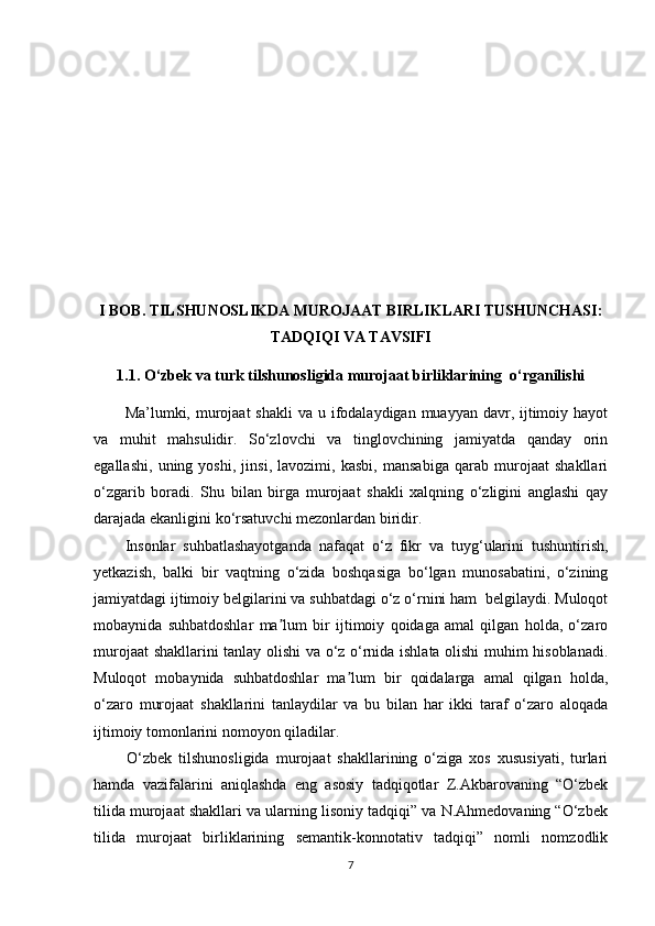 1.1. O‘zbek va turk tilshunosligida murojaat birliklarining o‘rganilishi……………7