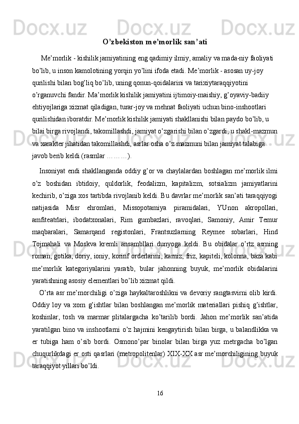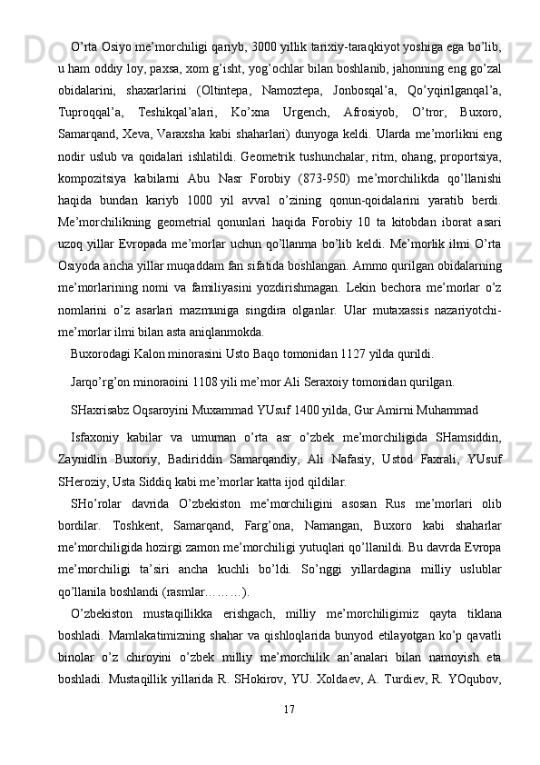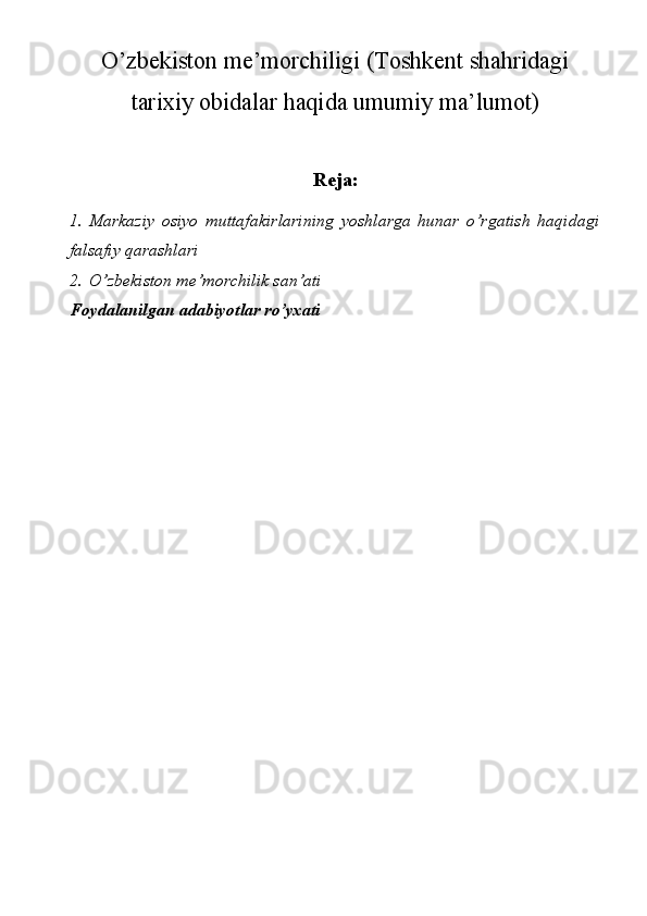 O’zbekiston me'morchiligi (Toshkent shahridagi tarixiy obidalar haqida umumiy ma’lumot)