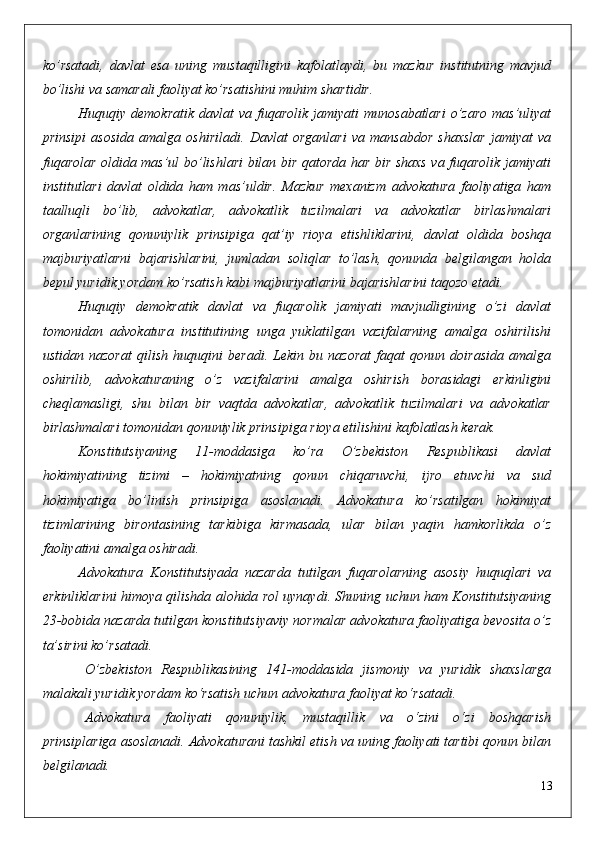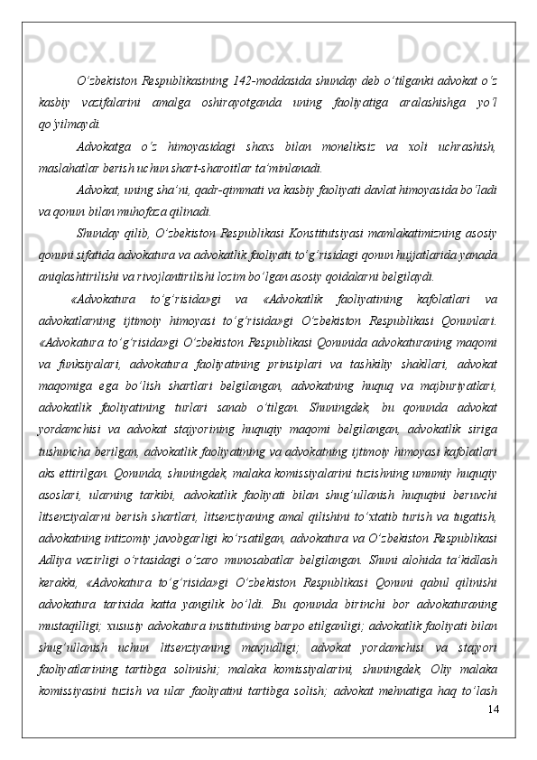 kafolatlarning   ham   to’xtatilishiga   asos   bo’ladi.   Bundan   advokatning   mustaqilligi