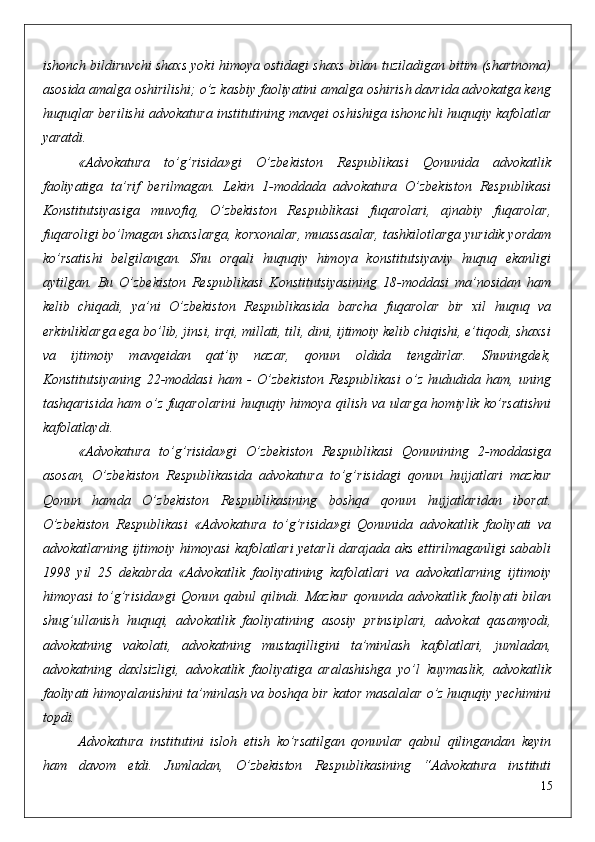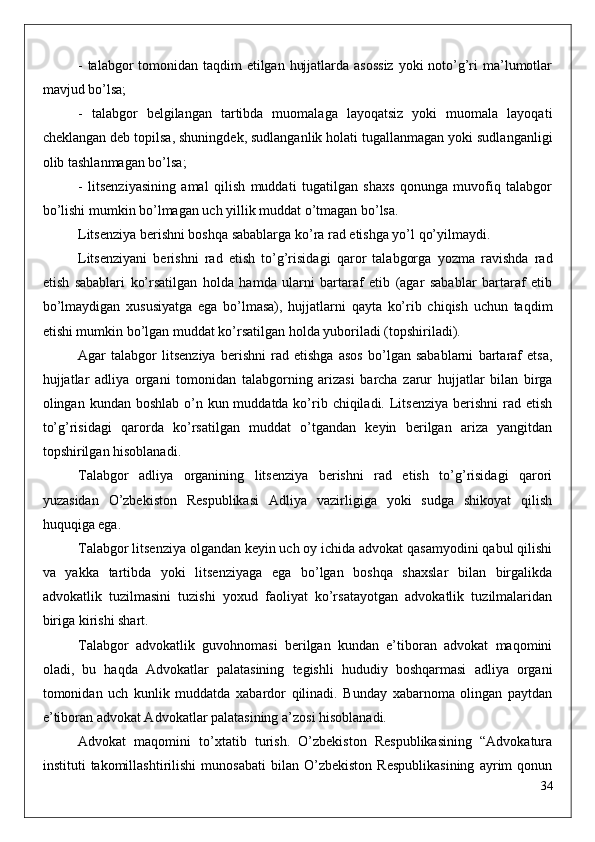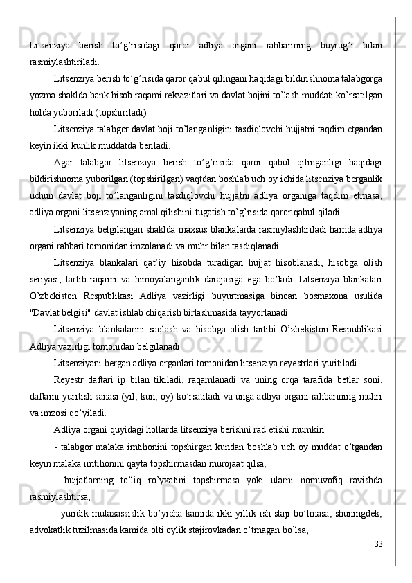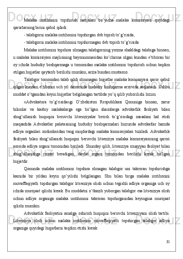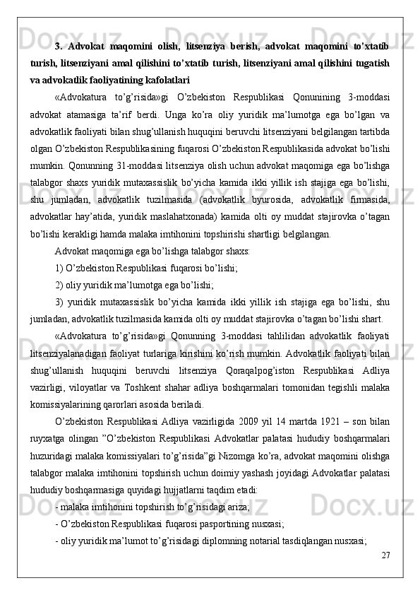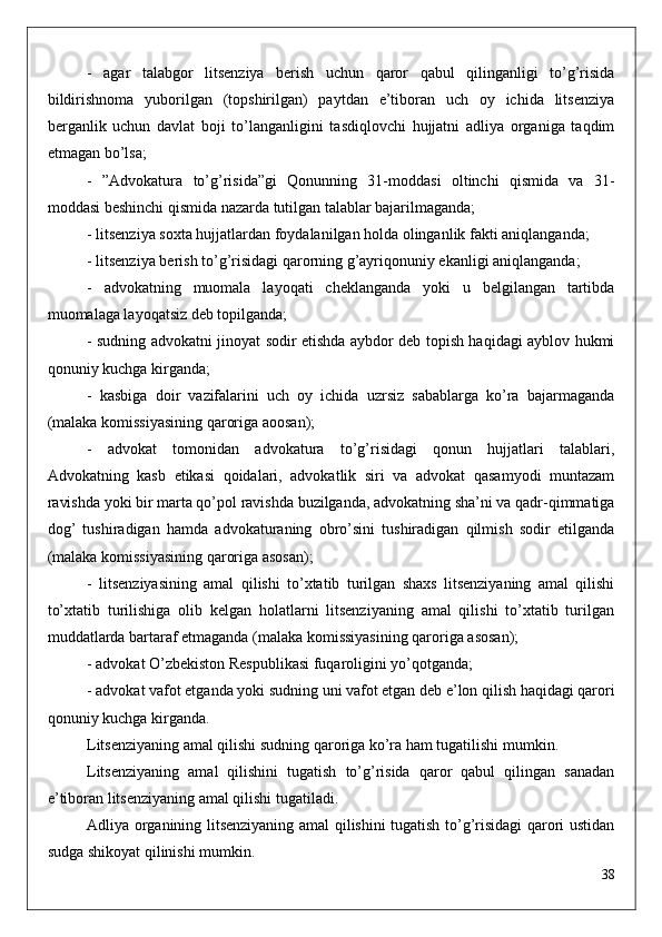 -   «Advokatura   to’g’risida»gi   Qonunning   15-moddasiga   muvofiq,   litsenziyaning