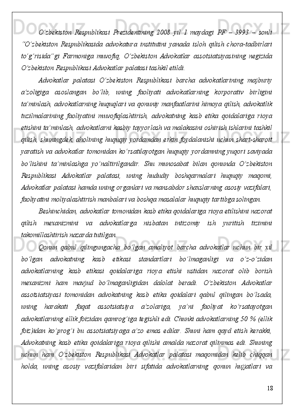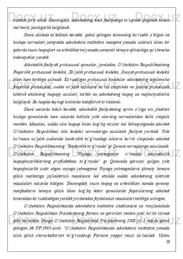 qilingan   №   PF-3993-sonli   “O’zbekiston   Respublikasida   advokatura   institutini   yanada