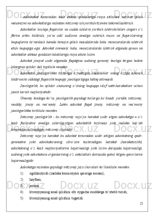 22 Bu   talablar   mutlaqo   o’rinli   edi,   chunki   advokat   faoliyati   sud,   prokuratura,
