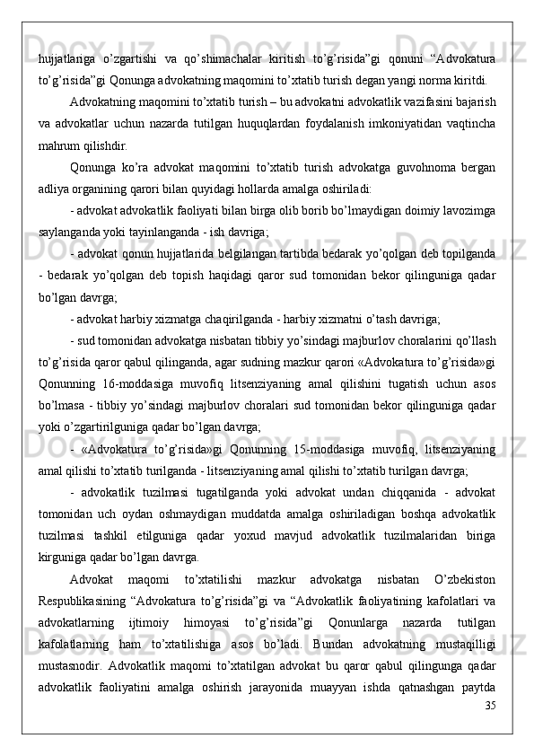 to’g’risida”gi Qonunga advokatning maqomini to’xtatib turish degan yangi norma kiritdi.