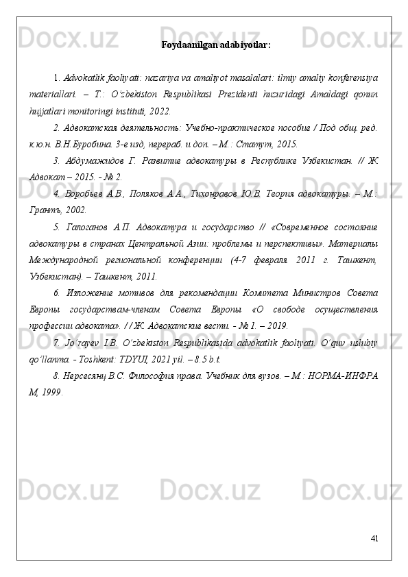 advokatura   tizimi   va   advokatlar   uchun   belgilangan   huquqiy   tartibot   va   asosiy   qonunlari