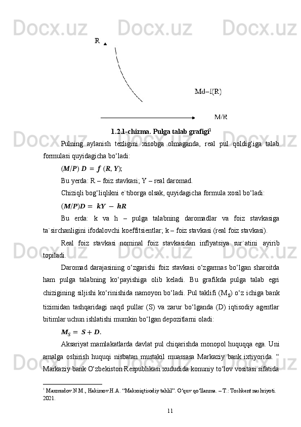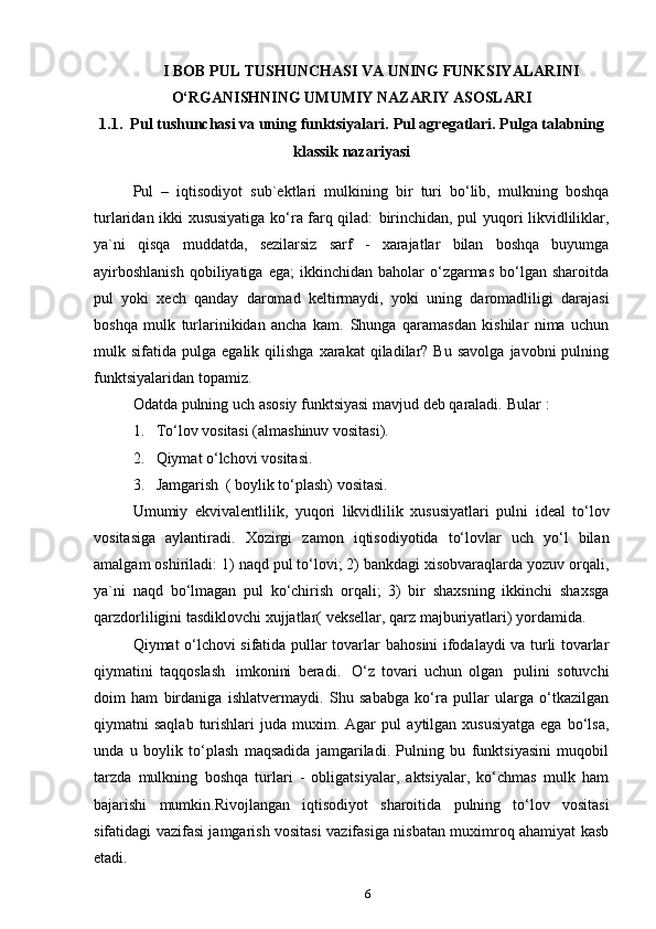 1.1. Pul   tushunchasi   va   uning   funktsiyalari.   Pul   agregatlari.   Pulga   talabning