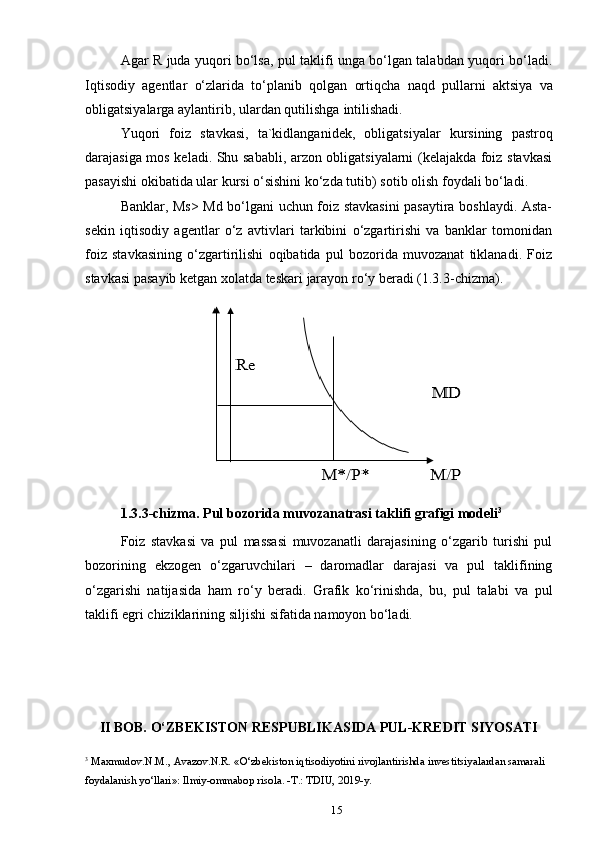 15Agar R juda yuqori bo‘lsa, pul taklifi unga bo‘lgan talabdan yuqori bo‘ladi.