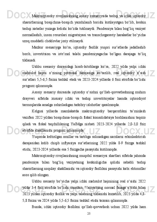 etadi. 25Makroiqtisodiy rivojlanishning asosiy  ssenariysida  tashqi  va ichki  iqtisodiy