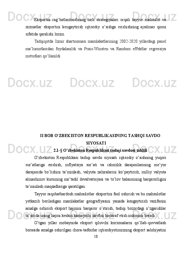 | 2.1-§. O‘zbekiston Respublikasi tashqi savdosi tahlili……………………….. | 18 |