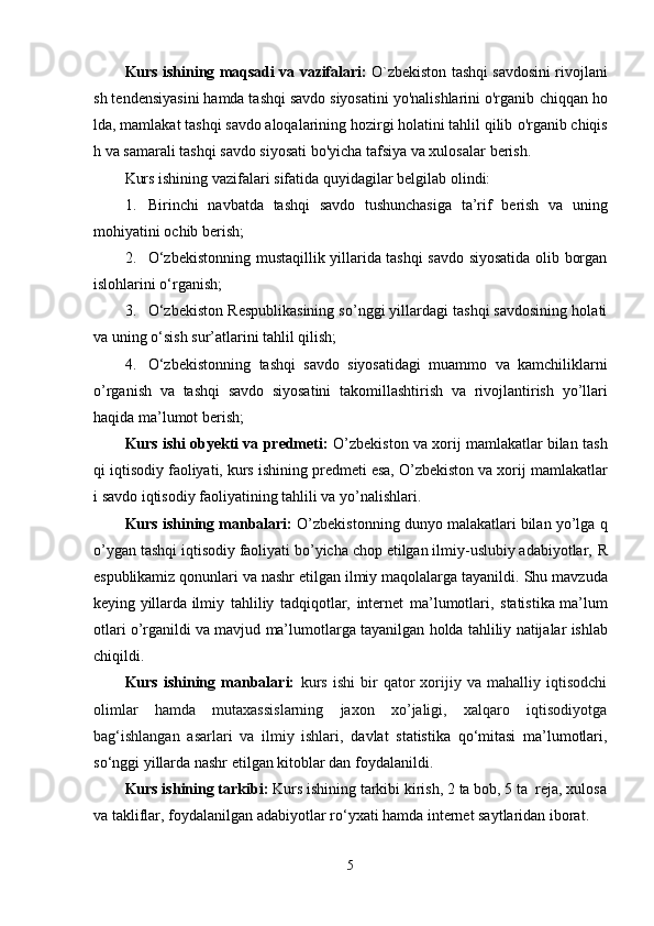 | 1.1-§. Importga ta’riflar. Importga ta’riflar kiritilishining iqtisodiy oqibatlari……………………………………………………………………… | 6 |