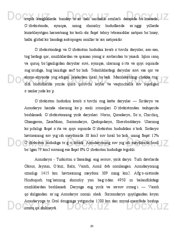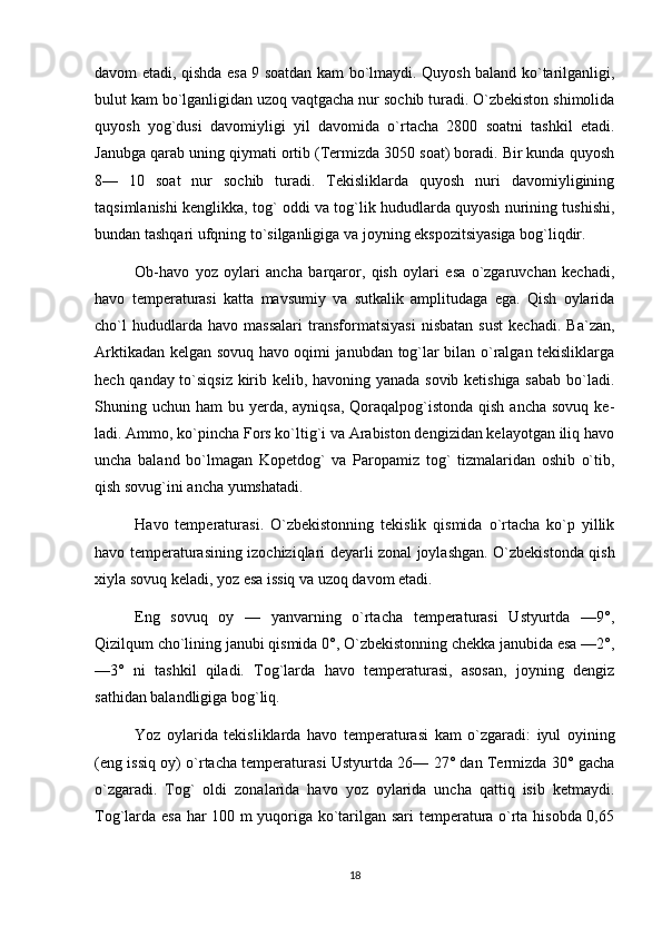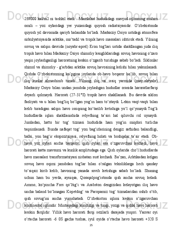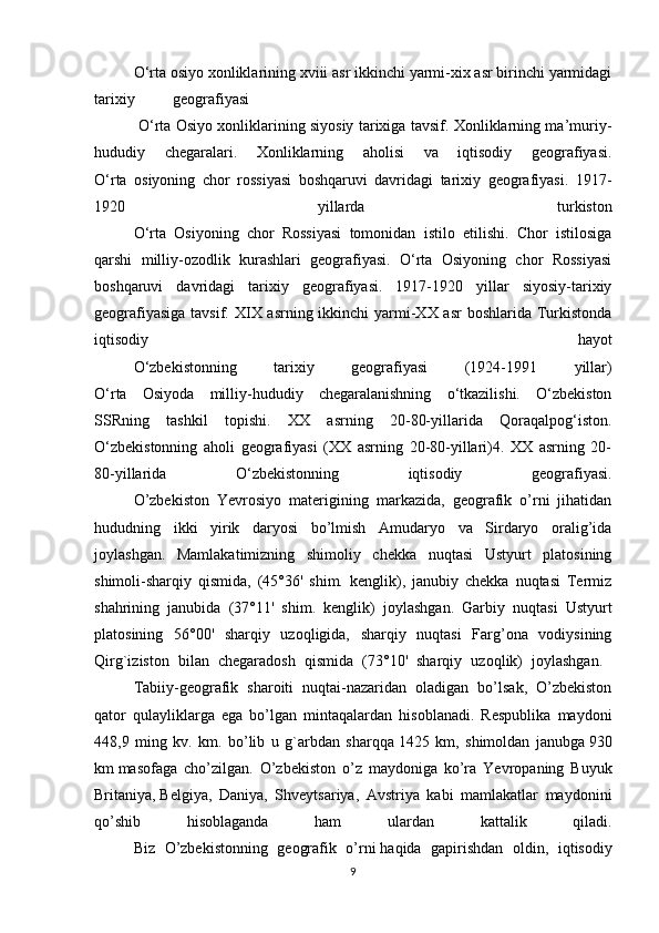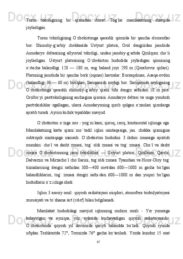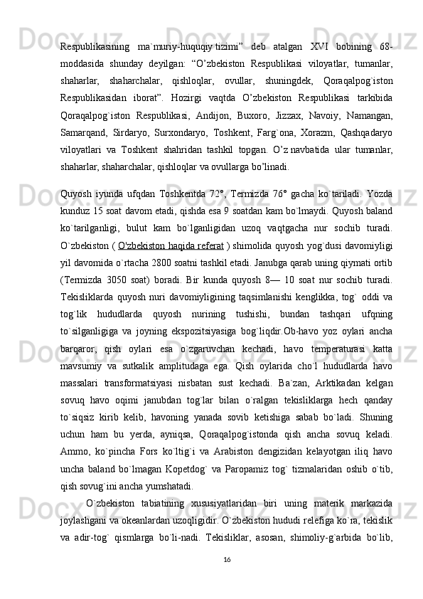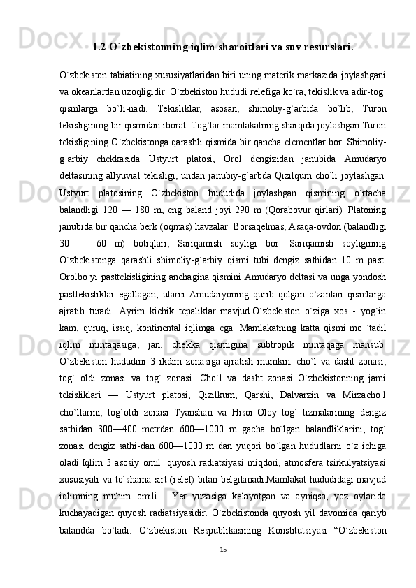 O’zbekiston tarixining geografik shakli, o’rni va tabiiy iqlim sharoiti