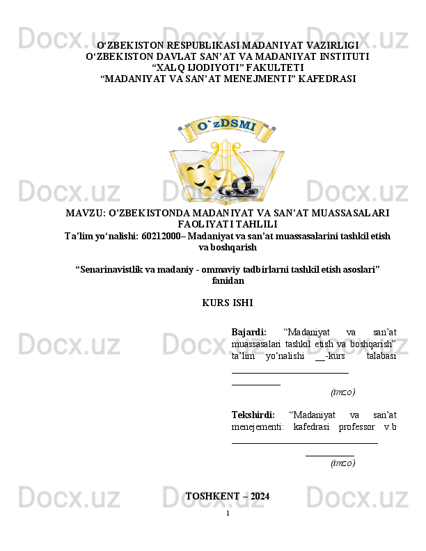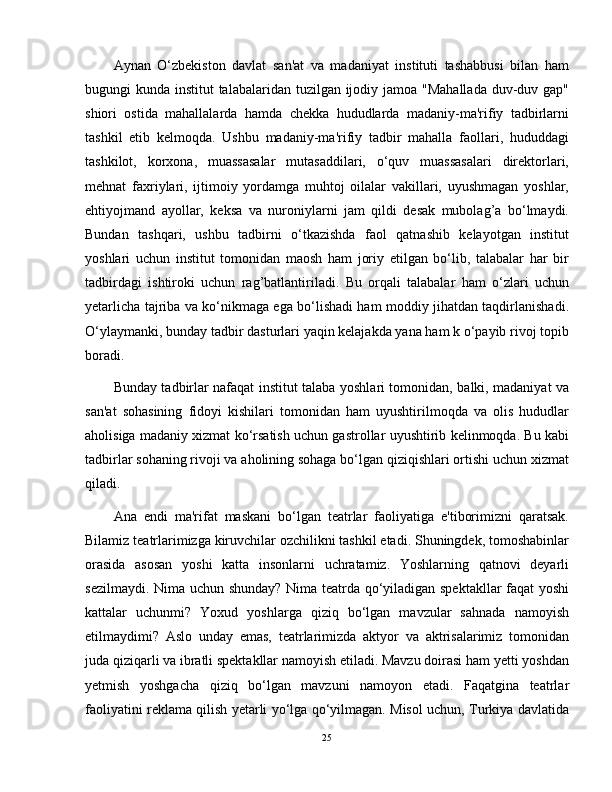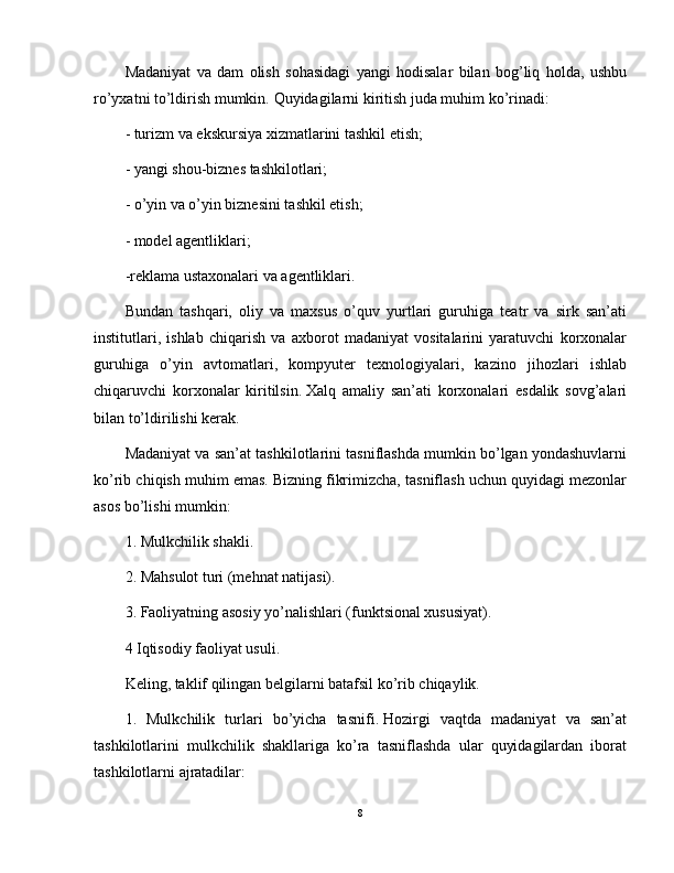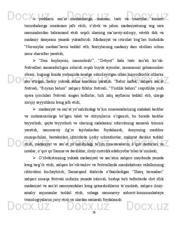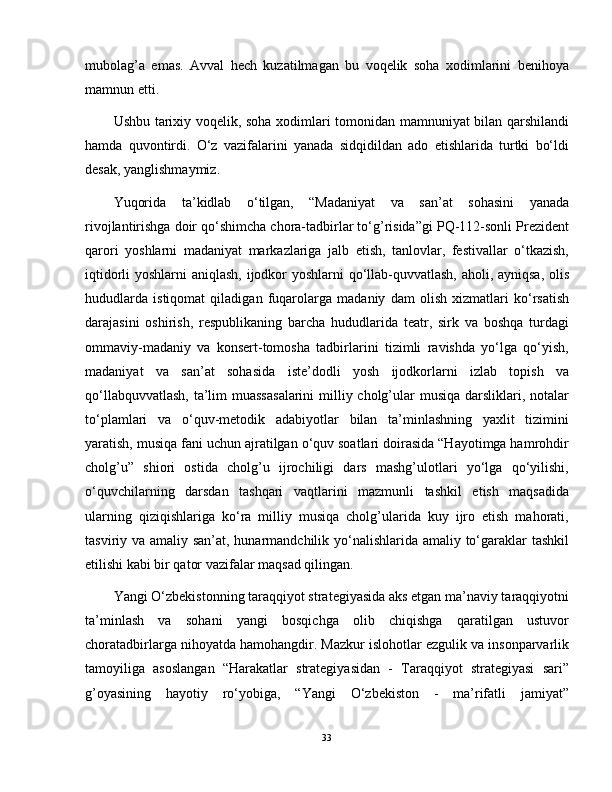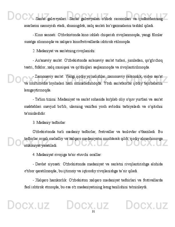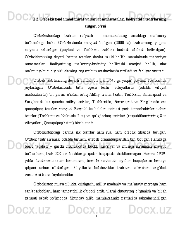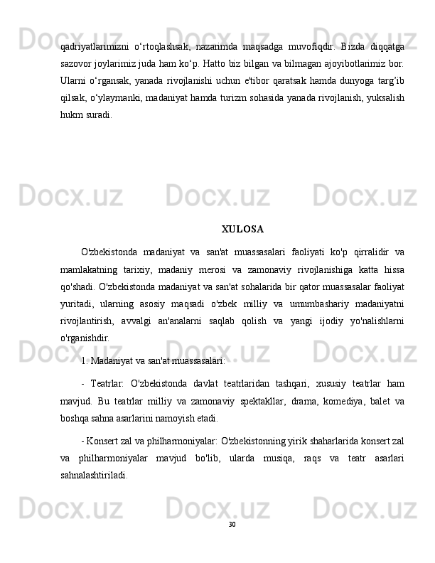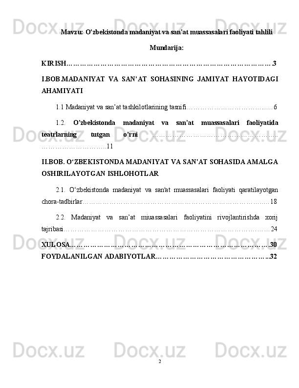 O’zbekistonda madaniyat va san'at muassasalari faoliyati tahlili 34 bet