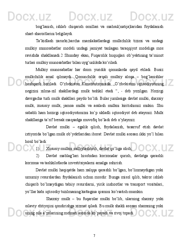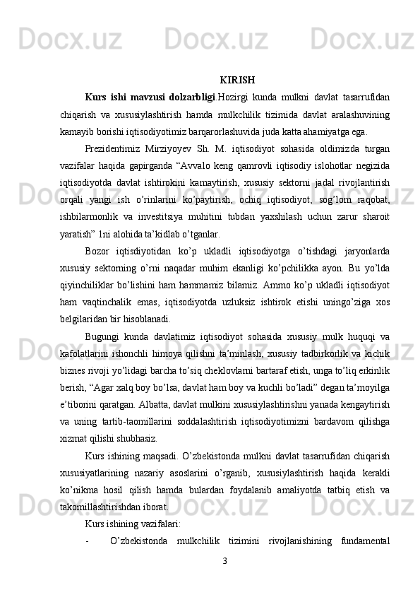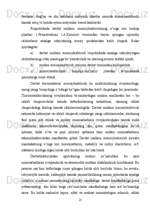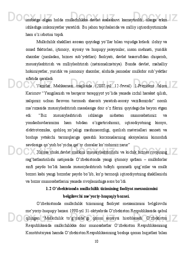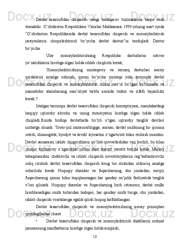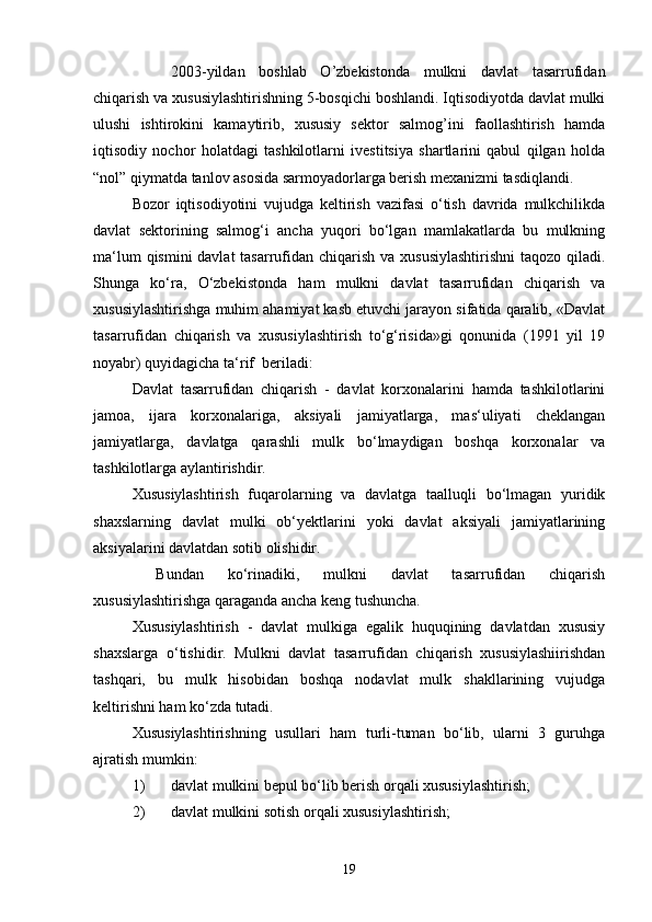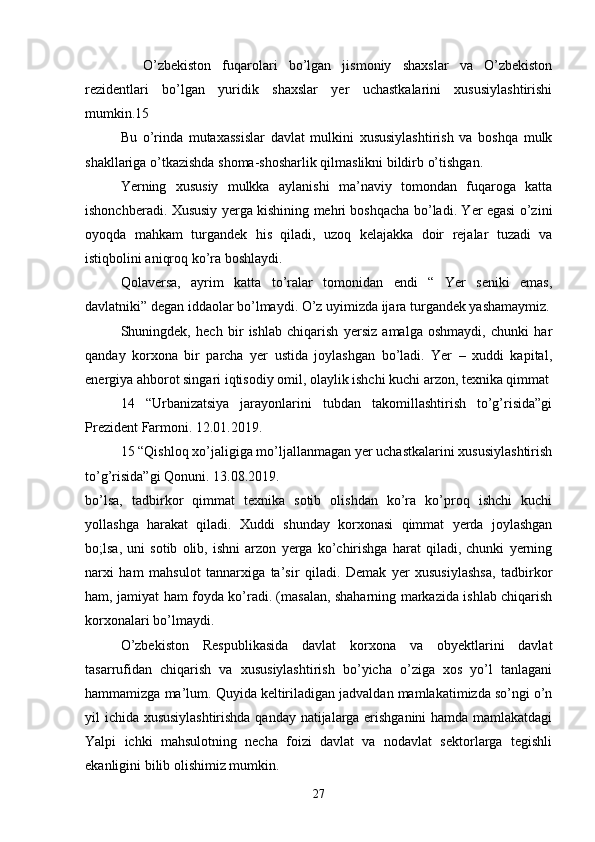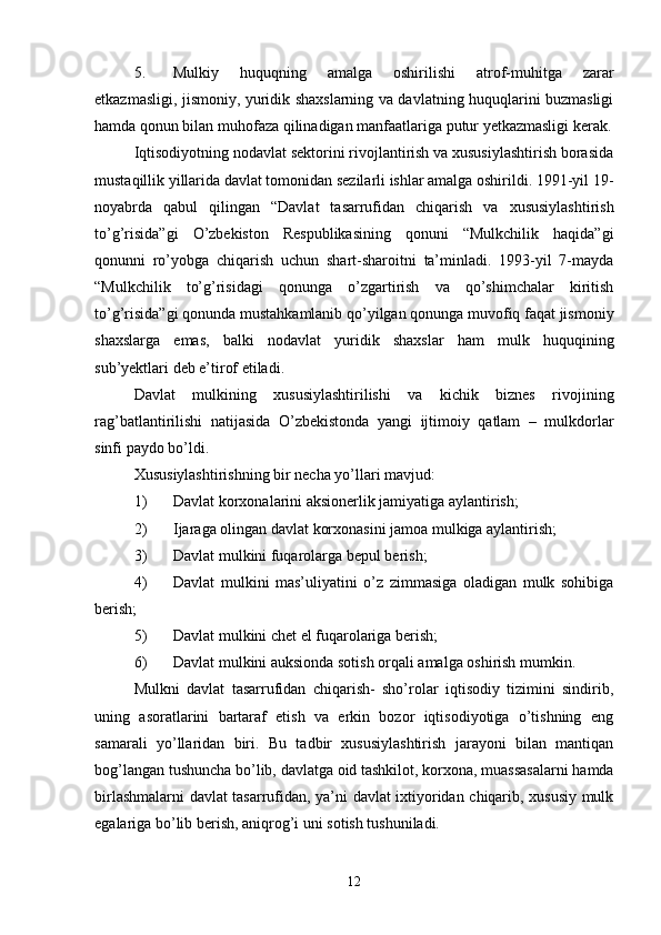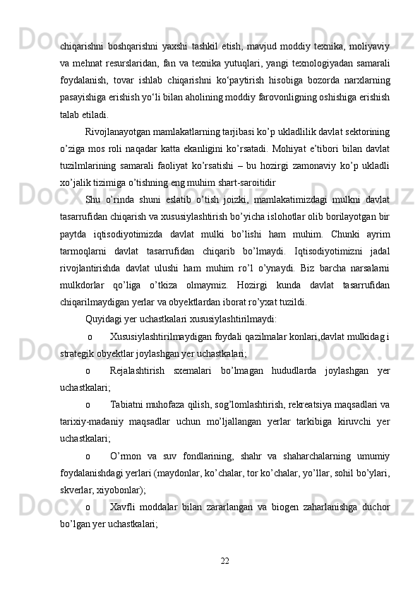 O'zbekistonda mulkni davlat tasarrufidan chiqarish