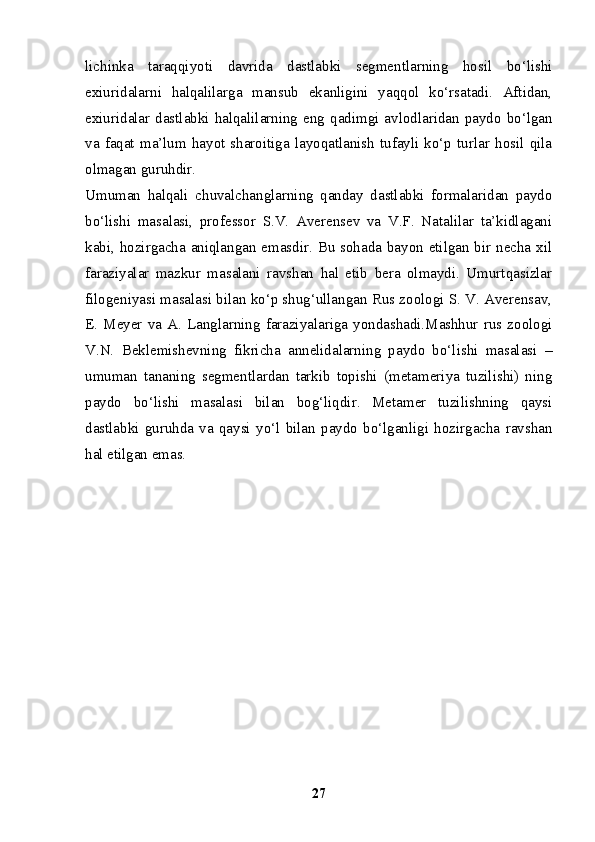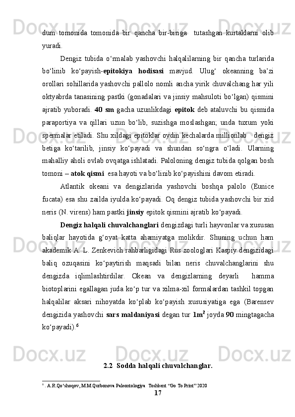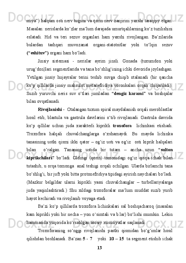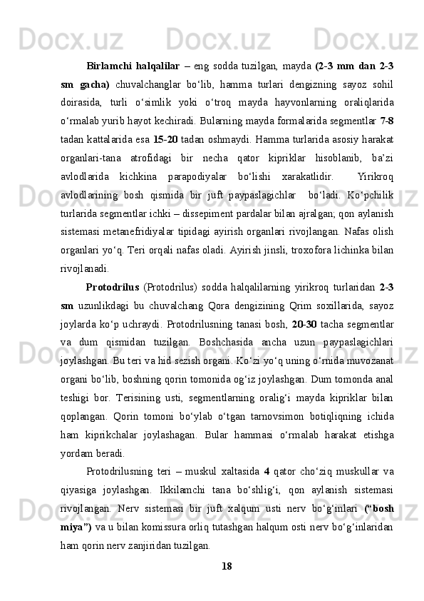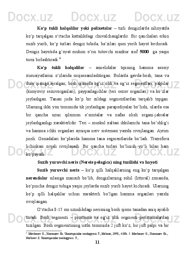 1.3.Ko‘p tukli halqali chuvalchanglar (Polychaeta) sinfi…………………..10