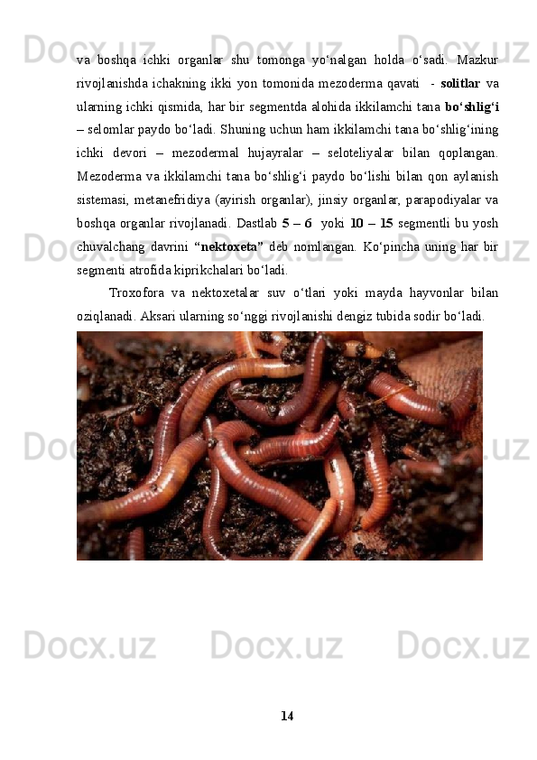 II.BOB. Halqali chuvalchanglar tipi tuzilishi,xilma-xilligi, tabiat va inson hayotidagi ahamiyati………………………………………………………14