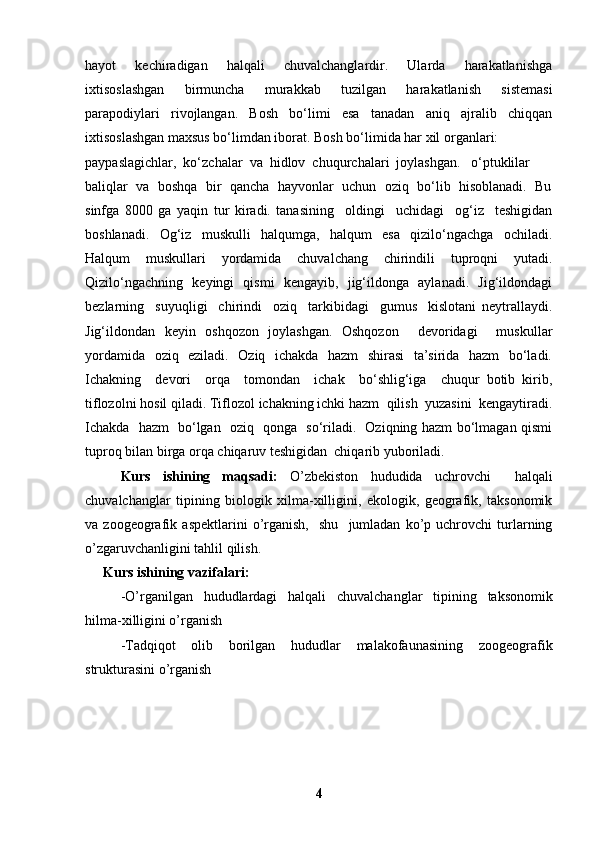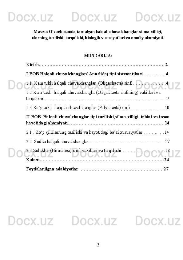 1.1 Kam tukli halqali chuvalchanglar. (Oligachaeta) sinfi………………….4