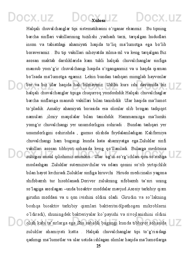 2.3 Zuluklar (Hirudinea) sinfi vakillari va tarqalishi…………….…….……18