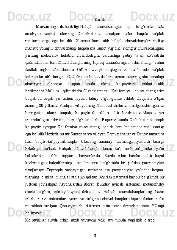 O‘zbekistonda tarqalgan halqali chuvalchanglar xilma-xilligi, ularning tuzilishi, tarqalishi, biologik xususiyatlari va amaliy ahamiyati