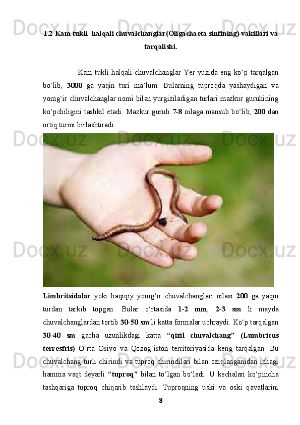 1.2 Kam tukli halqali chuvalchanglar(Oligachaeta sinfining) vakillari va tarqalishi………………………………………………………………….......7