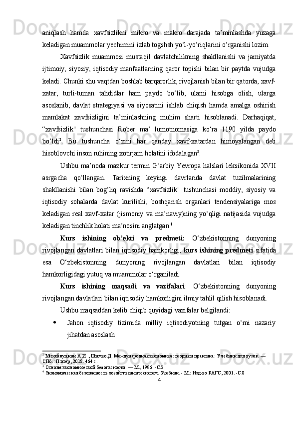 Mamatov A.A., Abulqosimov H.P., Mamatov S.A., Saidgaziyeva S.Sh. Iqtisodiy xavfsizlik. Darslik. – Toshkent: