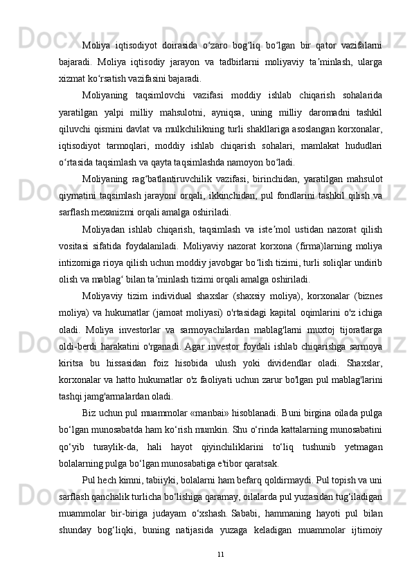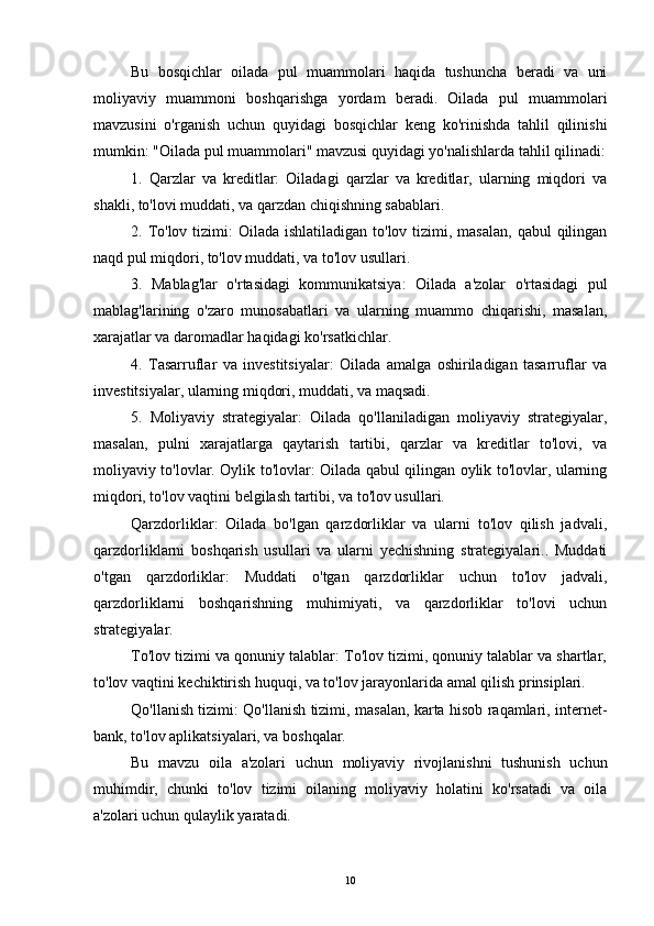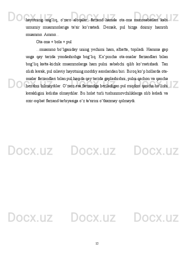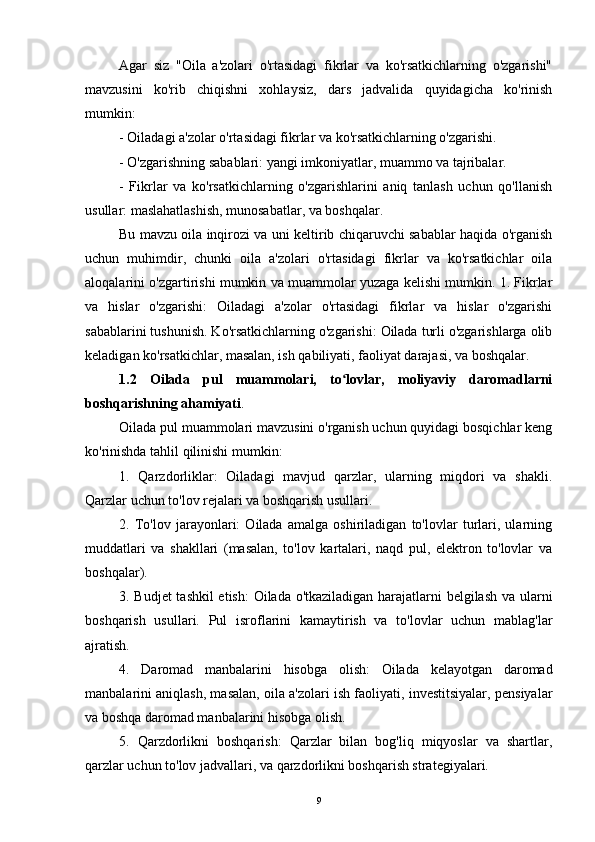 | 1.2. | Oilada pul muammolari, toʻlovlar, moliyaviy daromadlarni boshqarishning ahamiyati. | |