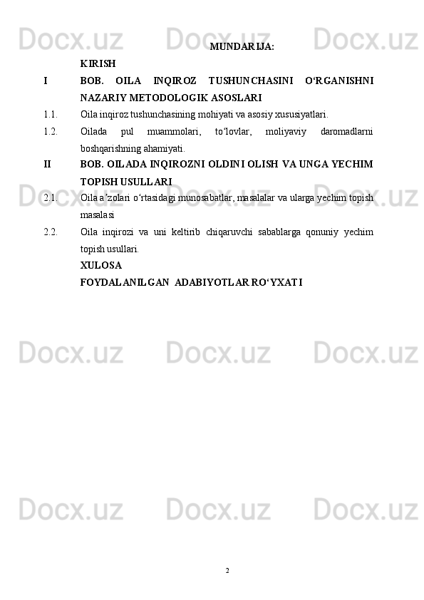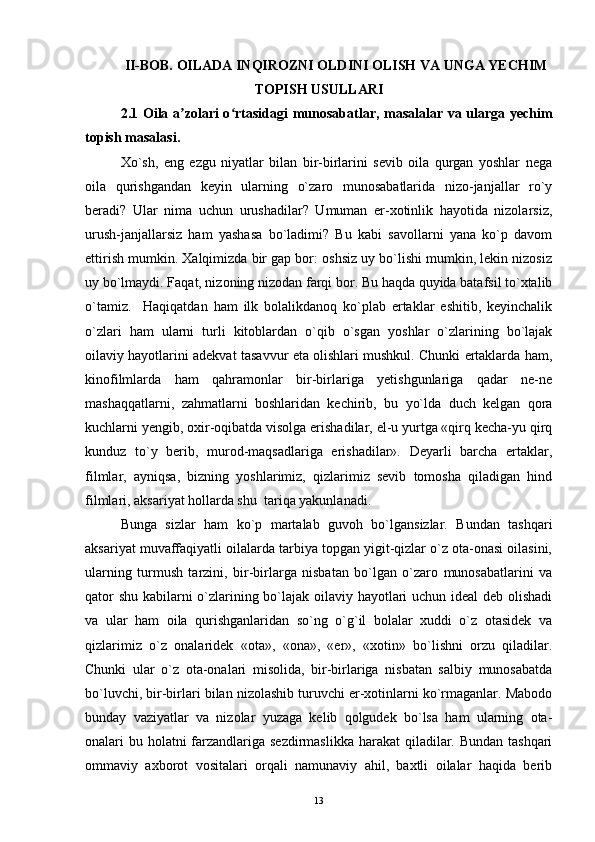 | II | BOB. OILADA INQIROZNI OLDINI OLISH VA UNGA YECHIM TOPISH USULLARI | |