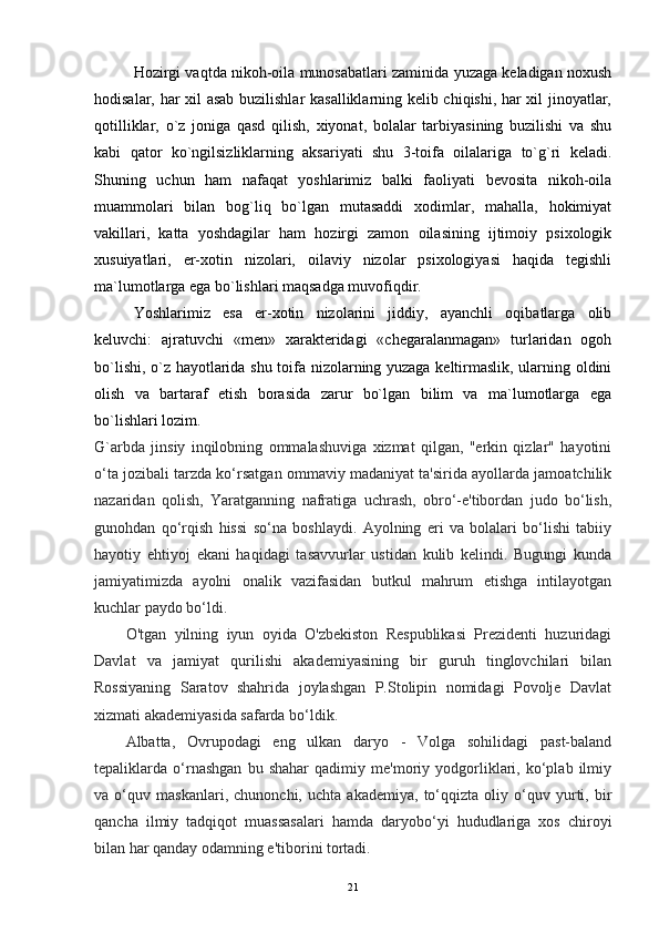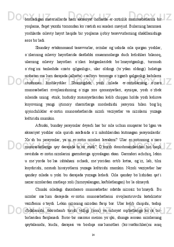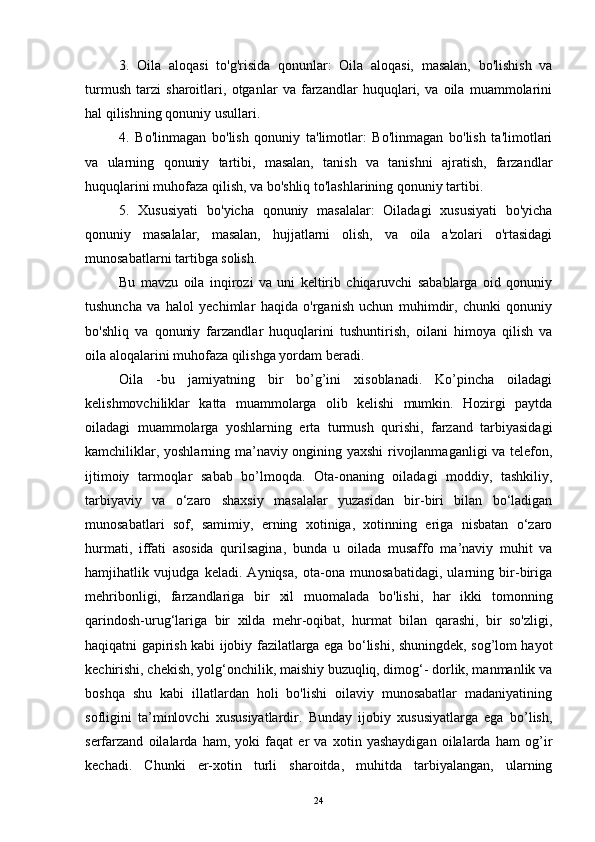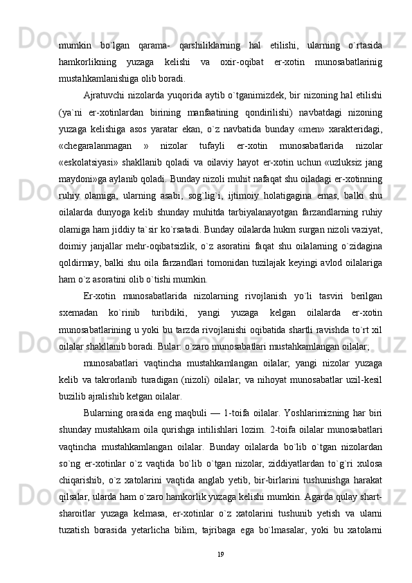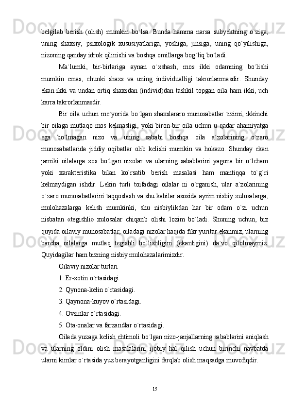 | 2.1. | Oila aʼzolari oʻrtasidagi munosabatlar, masalalar va ularga yechim topish masalasi | |
