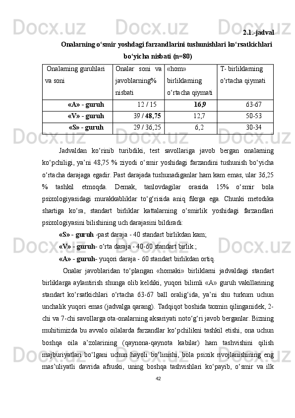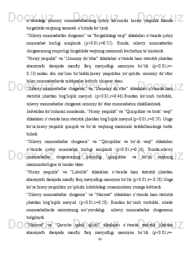 bo’ldi   (p<0.01;r=-0,22   ).   Bundan   ko’rinib   turibdiki   onalarda   munosabatlardagi