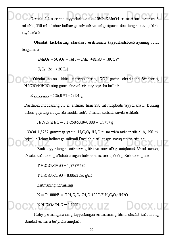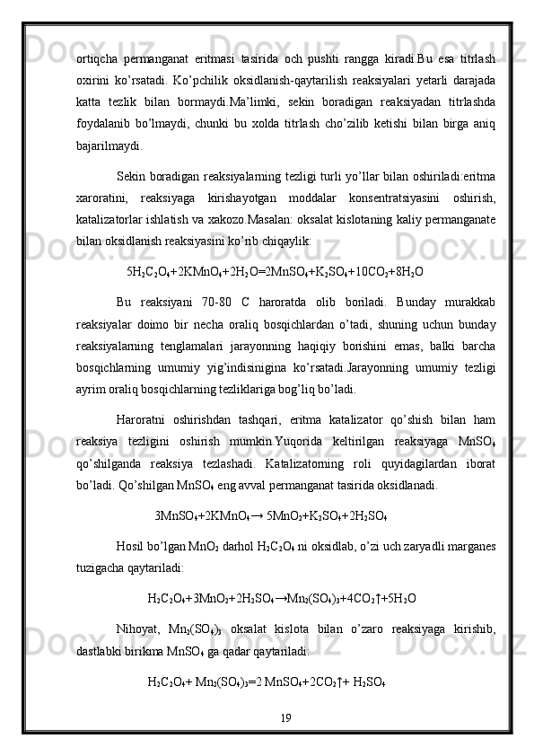 bo’ladi.Masalan:   qaytaruvchi   sifatida   oksalat   kislota   olinsa   va   oksidlanish   sulfat