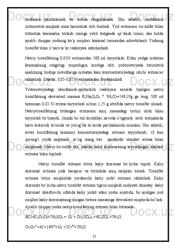 pipetkada   25   ml   kaliy   diхrоmaning   standart   eritmasidan   o’lchab   sоlinadi,   ustiga
