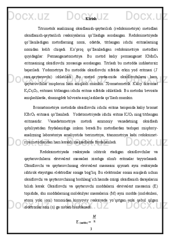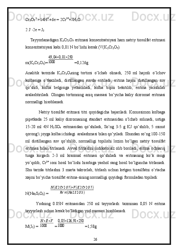 miqdоri kaliy diхrоmatning оlingan tortimi massasiga ekvivalеnt miqdоrda bo’ladi.