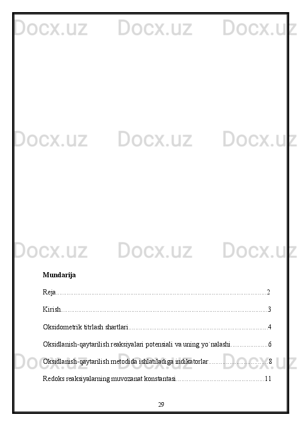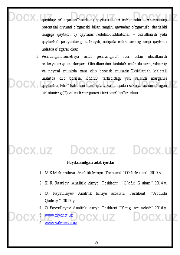 Oksidlanish-qaytarilish   reaksiyalari   asosida   titrlashda   ko`p   qo`llaniladigan