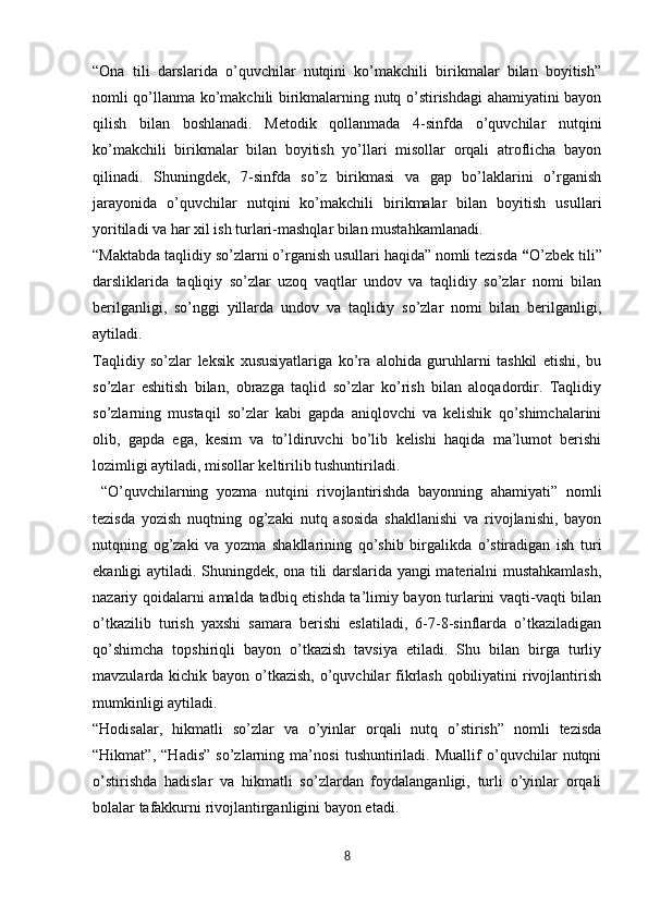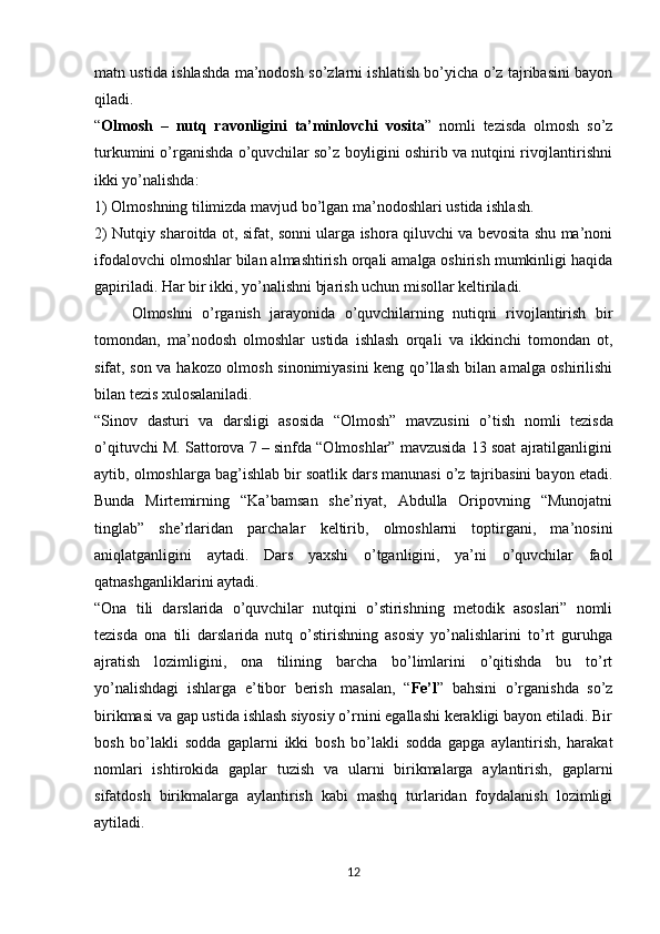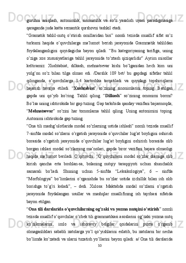 sinonimlardan   foydalanish”   nomli   tezisda   muallif   ona   tili   mashg’ulotlarida