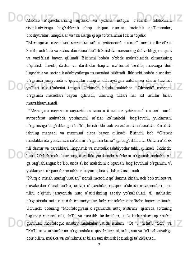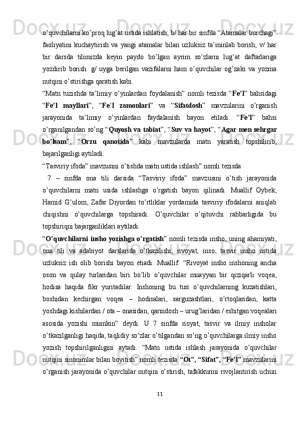 insho kabi ish turlaridan foydalandik. Metodik qo’llanma 7-sinfda ona tili o’qitish